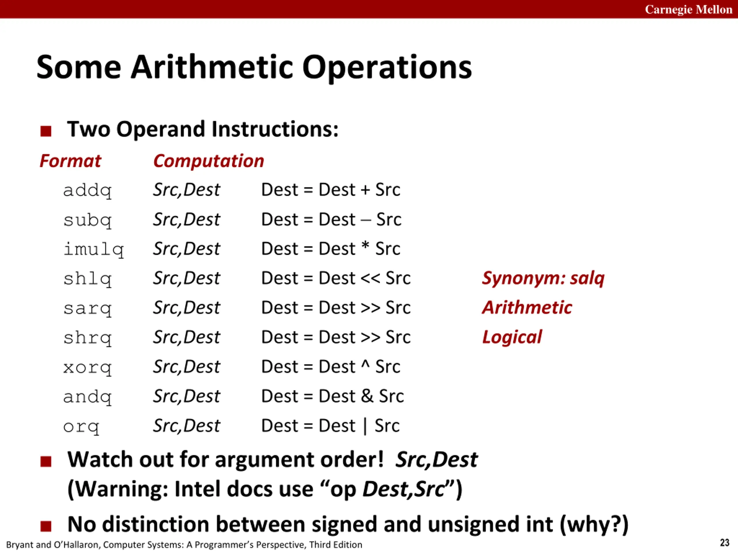 Carnegie Mellon Some Arithmetic Operations Two Operand Instructions: Format Computation addq Src,Dest subq Src,Dest imulq Src,Dest shlq Src,Dest sarq Src,Dest shrq Src,Dest xorq Src,Dest andq Src,Dest orq Src,Dest Dest = Dest + Src Dest = Dest Src Dest = Dest * Src Dest = Dest << Src Dest = Dest >> Src Dest = Dest >> Src Dest = Dest ^ Src Dest = Dest & Src Dest = Dest | Src Synonym: salq Arithmetic Logical Watch out for argument order! Src,Dest (Warning: Intel docs use op Dest,Src ) No distinction between signed and unsigned int (why?) 23 Bryant and O Hallaron, Computer Systems: A Programmer s Perspective, Third Edition