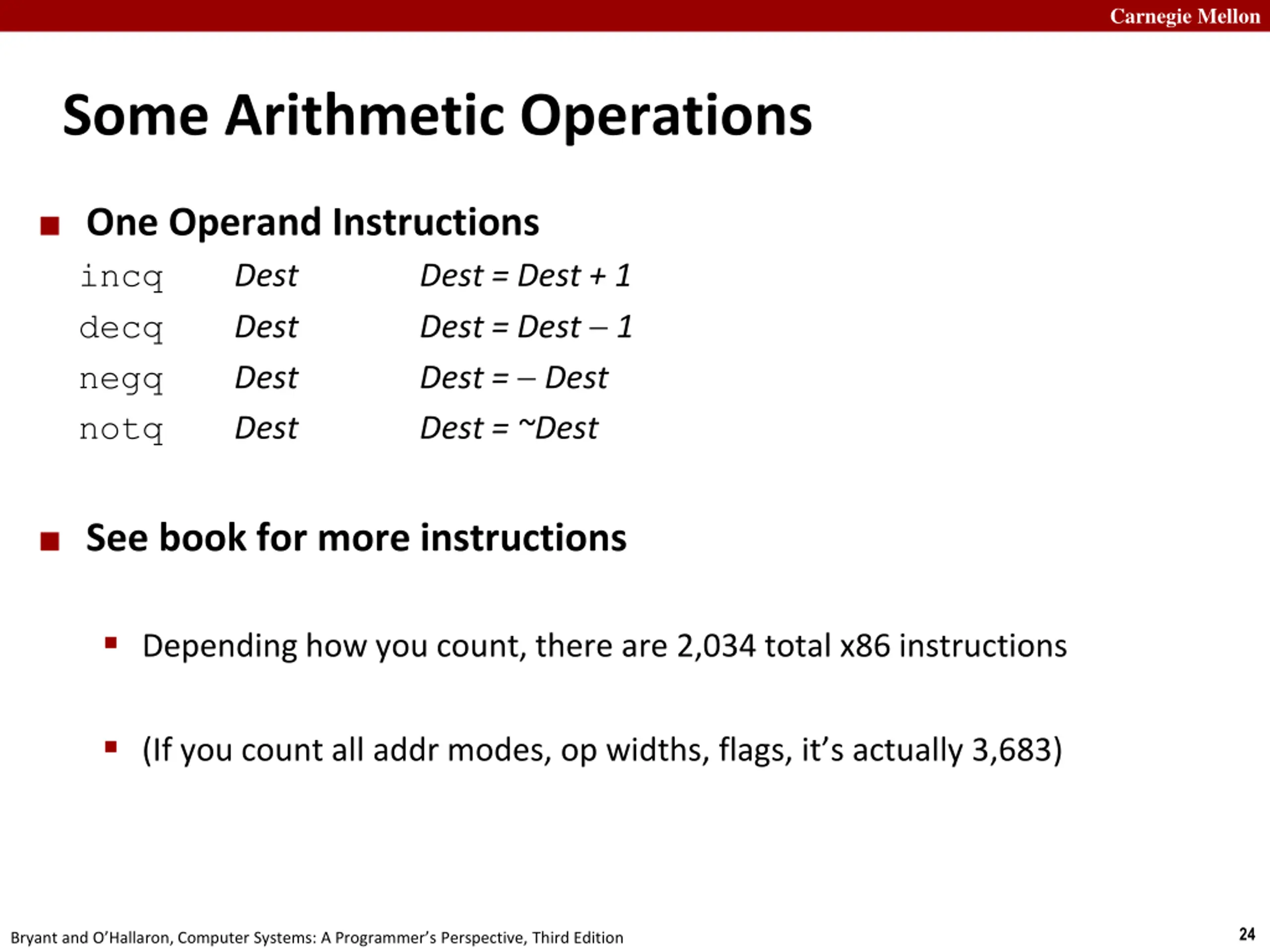 Carnegie Mellon Some Arithmetic Operations One Operand Instructions incq Dest decq Dest negq Dest notq Dest Dest = Dest + 1 Dest = Dest 1 Dest = Dest Dest = ~Dest See book for more instructions Depending how you count, there are 2,034 total x86 instructions (If you count all addr modes, op widths, flags, it s actually 3,683) 24 Bryant and O Hallaron, Computer Systems: A Programmer s Perspective, Third Edition