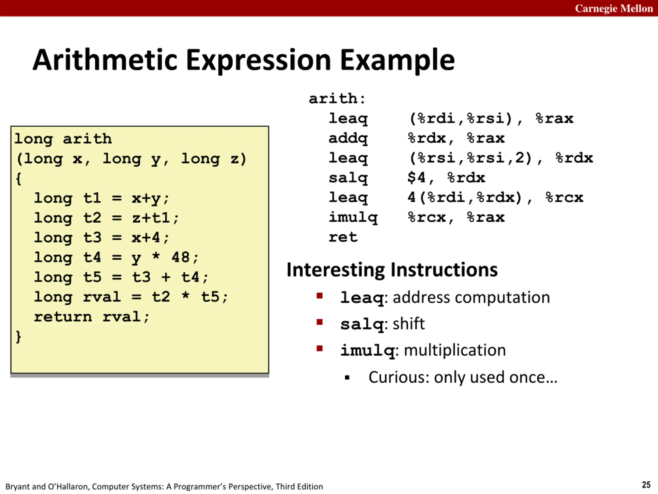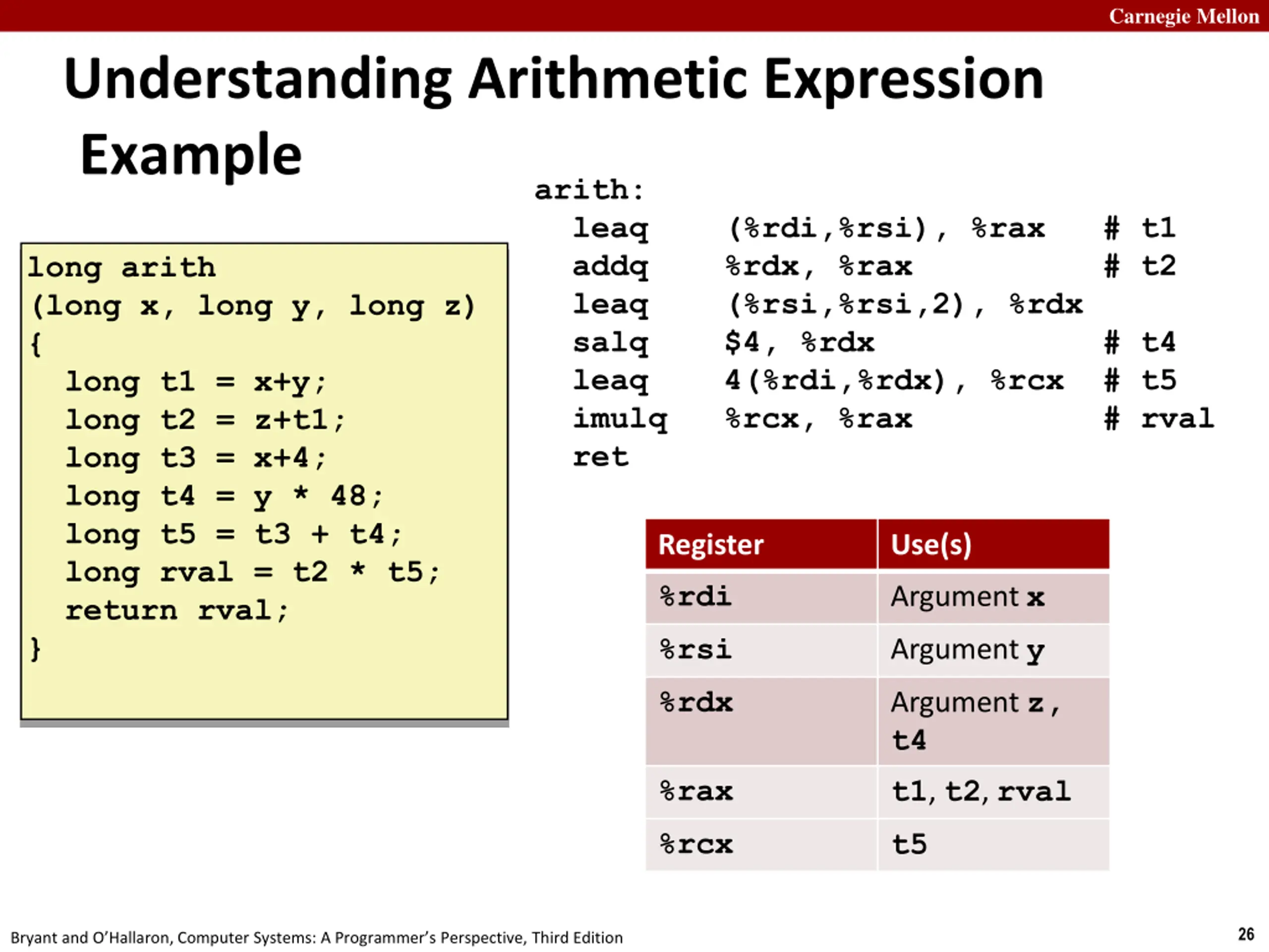 Carnegie Mellon Arithmetic Expression Example arith: leaq (%rdi,%rsi), %rax addq %rdx, %rax leaq (%rsi,%rsi,2), %rdx salq $4, %rdx leaq 4(%rdi,%rdx), %rcx imulq %rcx, %rax ret long arith (long x, long y, long z) { long t1 = x+y; long t2 = z+t1; long t3 = x+4; long t4 = y * 48; long t5 = t3 + t4; long rval = t2 * t5; return rval; } Interesting Instructions leaq: address computation salq: shift imulq: multiplication Curious: only used once 25 Bryant and O Hallaron, Computer Systems: A Programmer s Perspective, Third Edition