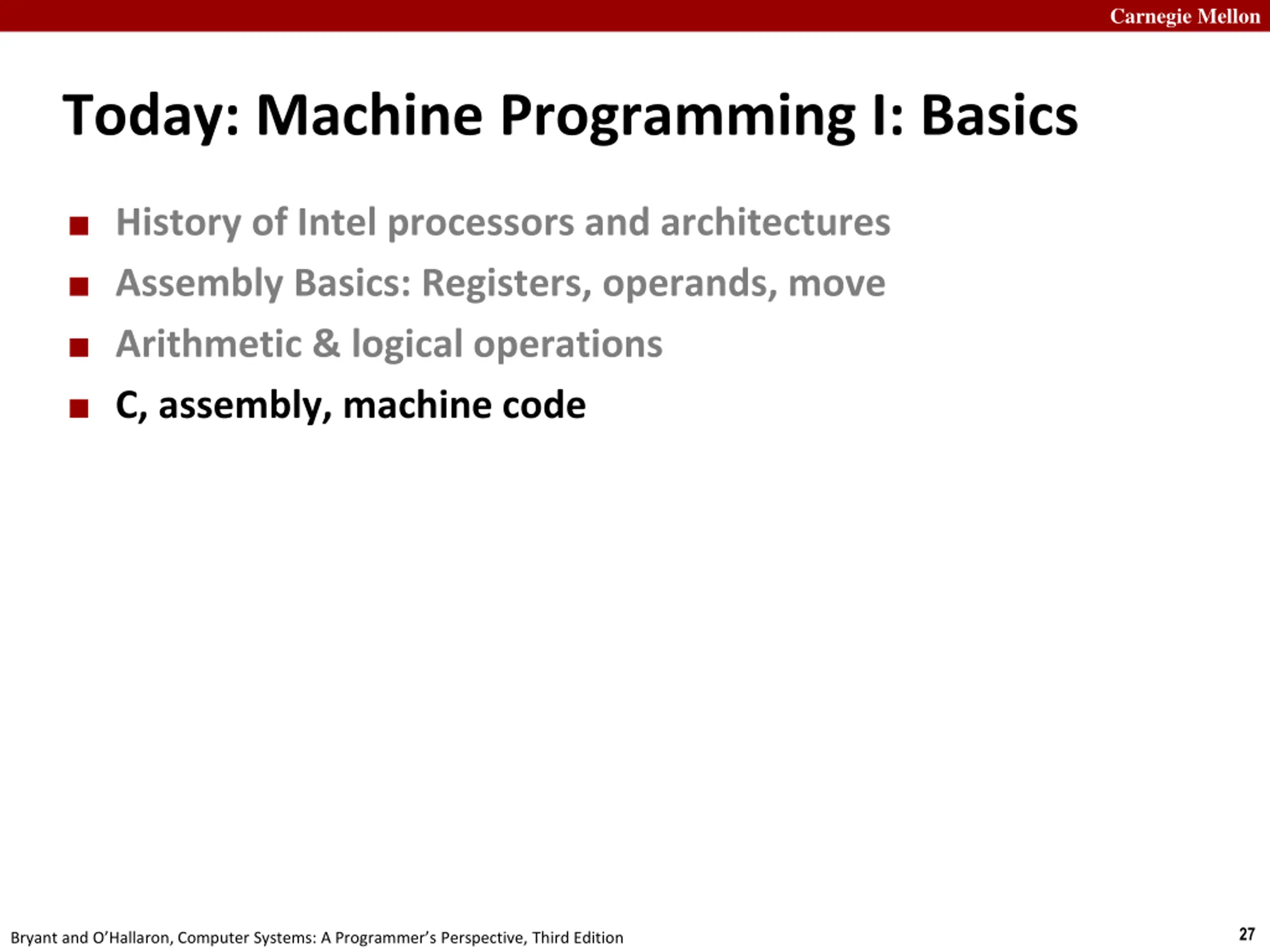 Carnegie Mellon Today: Machine Programming I: Basics History of Intel processors and architectures Assembly Basics: Registers, operands, move Arithmetic & logical operations C, assembly, machine code 27 Bryant and O Hallaron, Computer Systems: A Programmer s Perspective, Third Edition