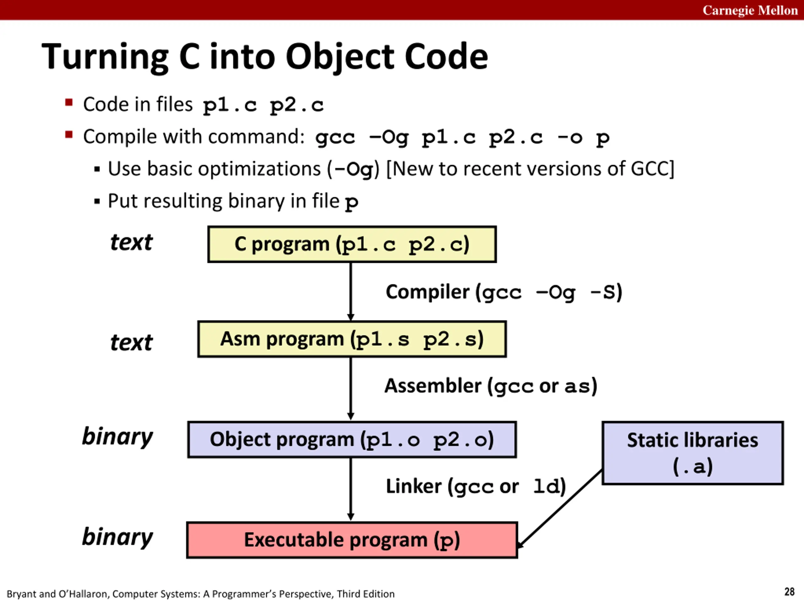 Carnegie Mellon Turning C into Object Code Code in files p1.c p2.c Compile with command: gcc Og p1.c p2.c -o p Use basic optimizations (-Og) [New to recent versions of GCC] Put resulting binary in file p text C program (p1.c p2.c) Compiler (gcc Og -S) Asm program (p1.s p2.s) text Assembler (gcc or as) binary Object program (p1.o p2.o) Static libraries (.a) Linker (gcc or ld) binary Executable program (p) 28 Bryant and O Hallaron, Computer Systems: A Programmer s Perspective, Third Edition