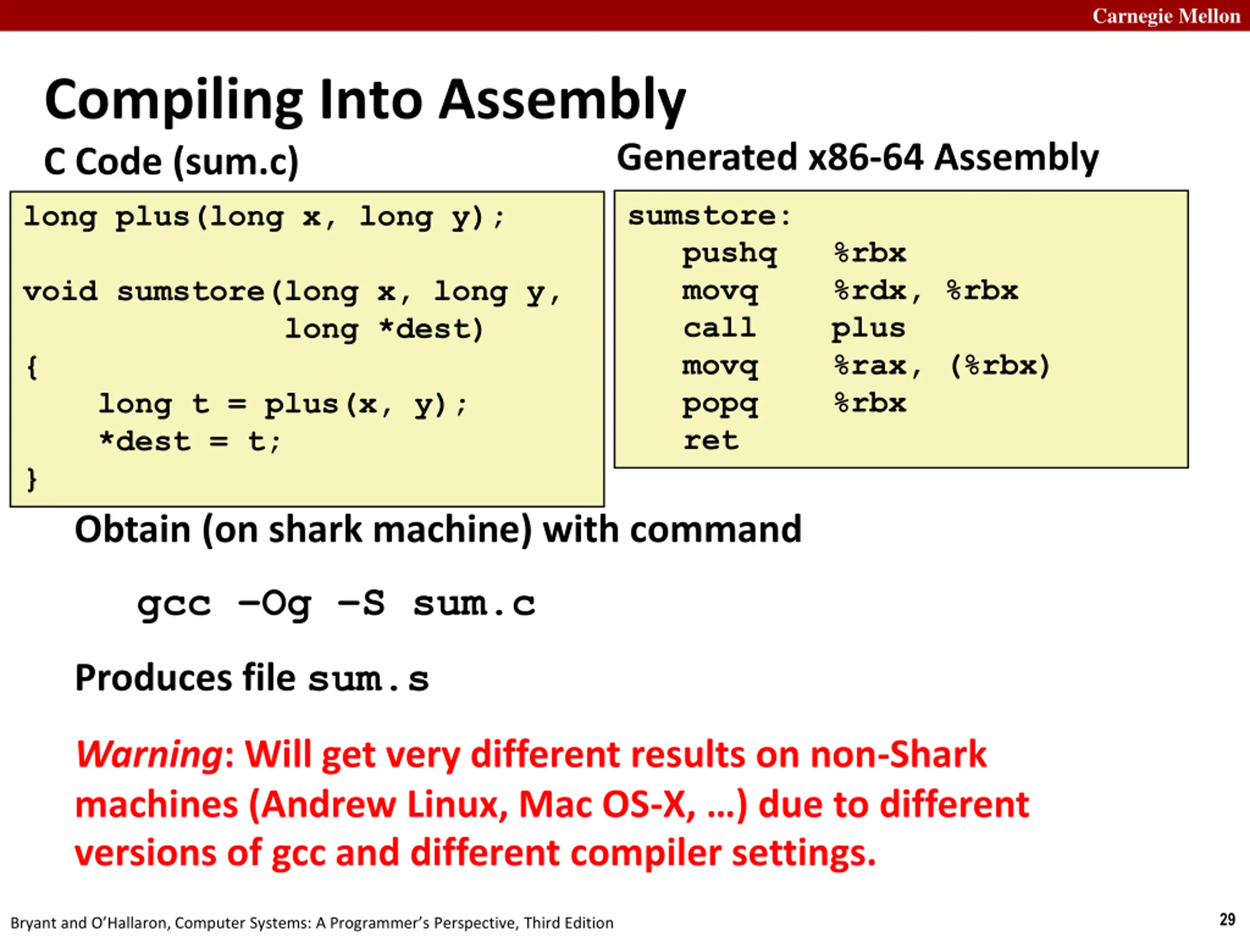 Carnegie Mellon Compiling Into Assembly C Code (sum.c) long plus(long x, long y); Generated x86-64 Assembly sumstore: pushq %rbx movq %rdx, %rbx call plus movq %rax, (%rbx) popq %rbx ret void sumstore(long x, long y, long *dest) { long t = plus(x, y); *dest = t; } Obtain (on shark machine) with command gcc Og S sum.c Produces file sum.s Warning: Will get very different results on non-Shark machines (Andrew Linux, Mac OS-X, ) due to different versions of gcc and different compiler settings. 29 Bryant and O Hallaron, Computer Systems: A Programmer s Perspective, Third Edition