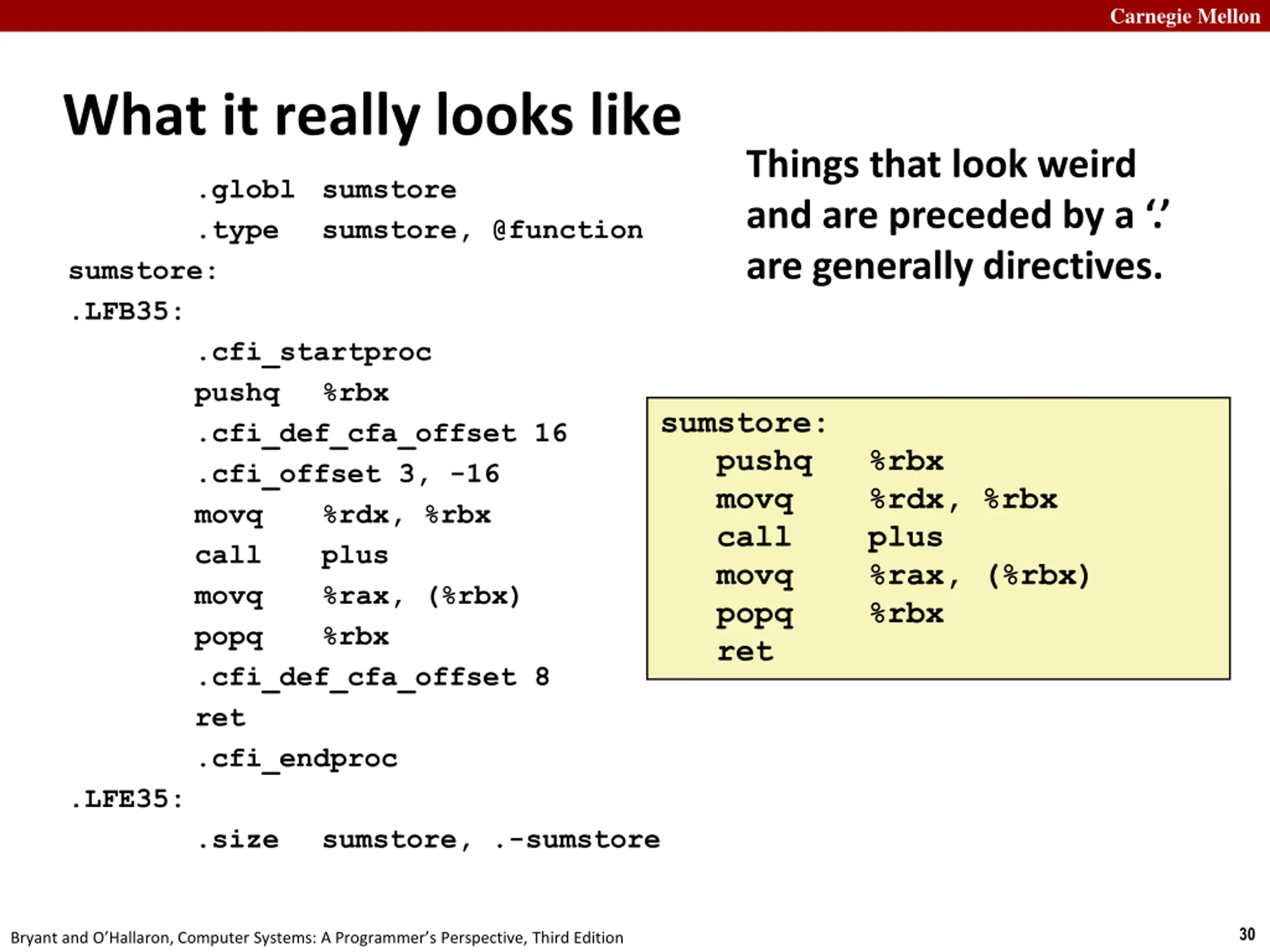 Carnegie Mellon What it really looks like Things that look weird and are preceded by a . are generally directives. .globl sumstore .type sumstore, @function sumstore: .LFB35: .cfi_startproc pushq %rbx .cfi_def_cfa_offset 16 .cfi_offset 3, -16 movq %rdx, %rbx call plus movq %rax, (%rbx) popq %rbx .cfi_def_cfa_offset 8 ret .cfi_endproc .LFE35: .size sumstore, .-sumstore sumstore: pushq %rbx movq %rdx, %rbx call plus movq %rax, (%rbx) popq %rbx ret 30 Bryant and O Hallaron, Computer Systems: A Programmer s Perspective, Third Edition