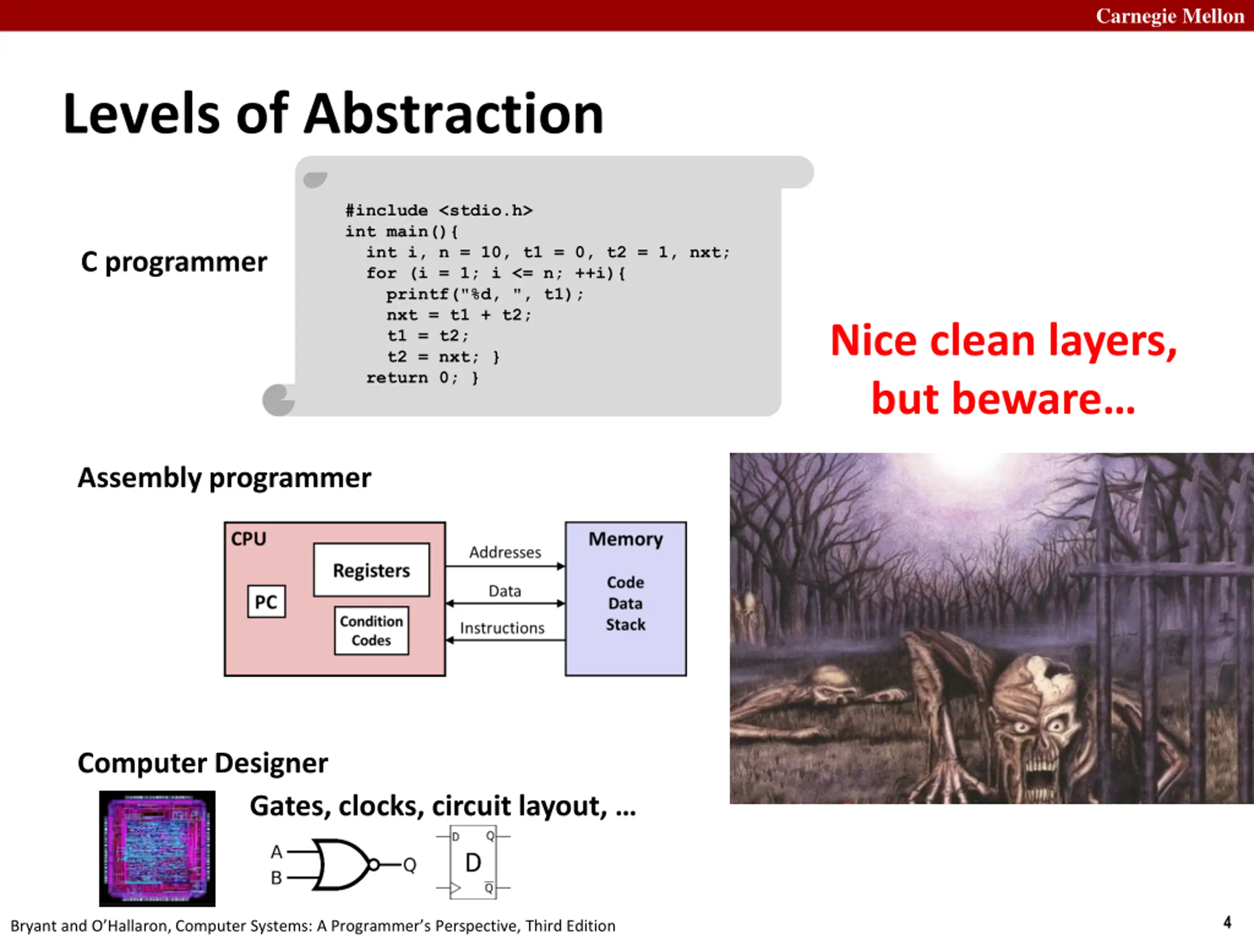 Carnegie Mellon Levels of Abstraction #include <stdio.h> int main(){ int i, n = 10, t1 = 0, t2 = 1, nxt; for (i = 1; i <= n; ++i){ printf("%d, ", t1); nxt = t1 + t2; t1 = t2; t2 = nxt; } return 0; } C programmer Nice clean layers, but beware Assembly programmer Computer Designer Gates, clocks, circuit layout, 4 Bryant and O Hallaron, Computer Systems: A Programmer s Perspective, Third Edition
