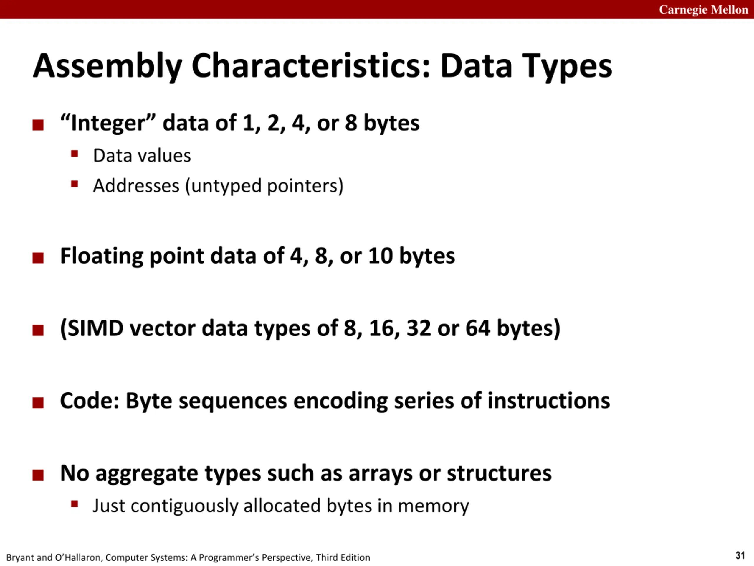 Carnegie Mellon Assembly Characteristics: Data Types Integer data of 1, 2, 4, or 8 bytes Data values Addresses (untyped pointers) Floating point data of 4, 8, or 10 bytes (SIMD vector data types of 8, 16, 32 or 64 bytes) Code: Byte sequences encoding series of instructions No aggregate types such as arrays or structures Just contiguously allocated bytes in memory 31 Bryant and O Hallaron, Computer Systems: A Programmer s Perspective, Third Edition