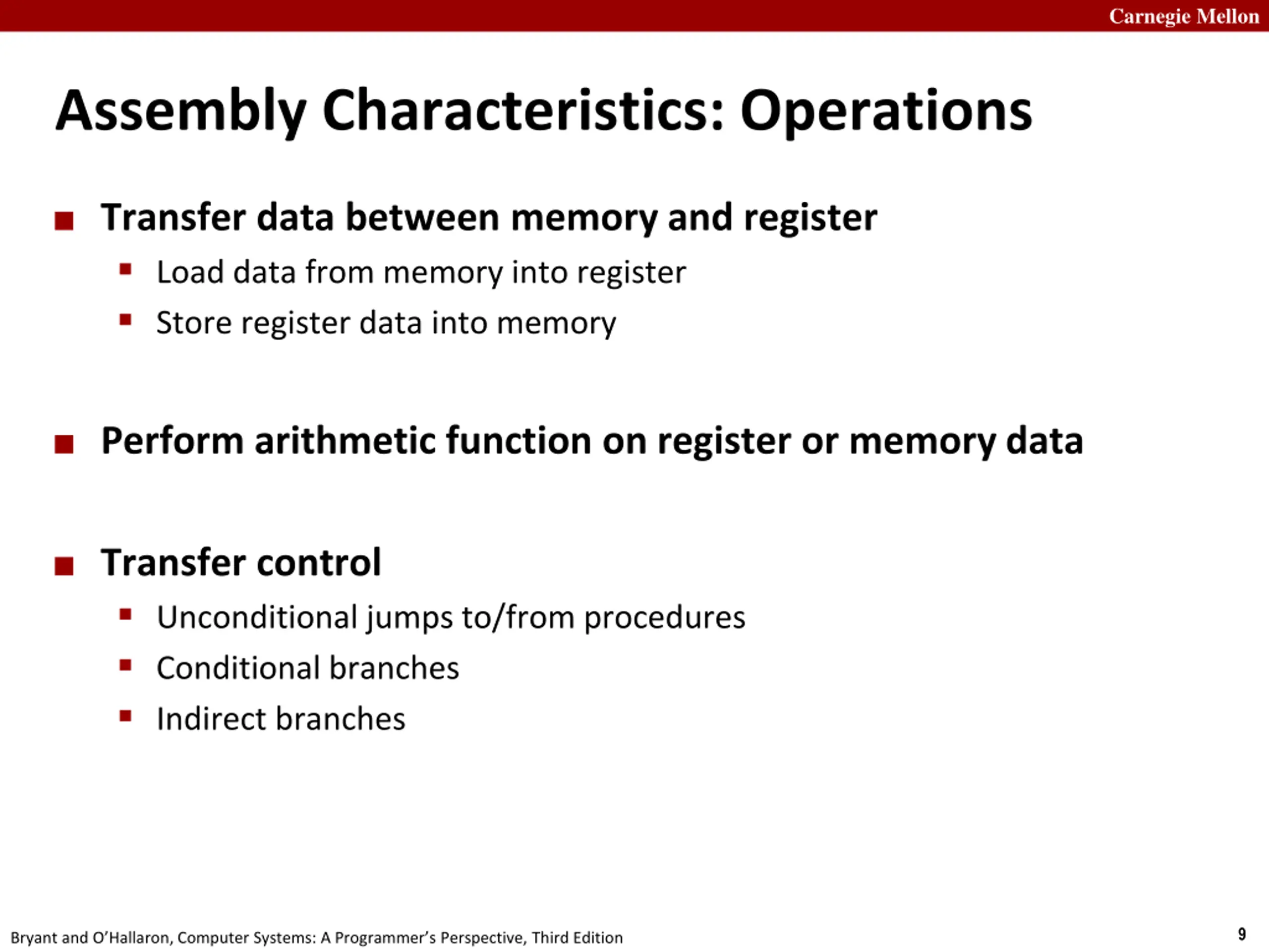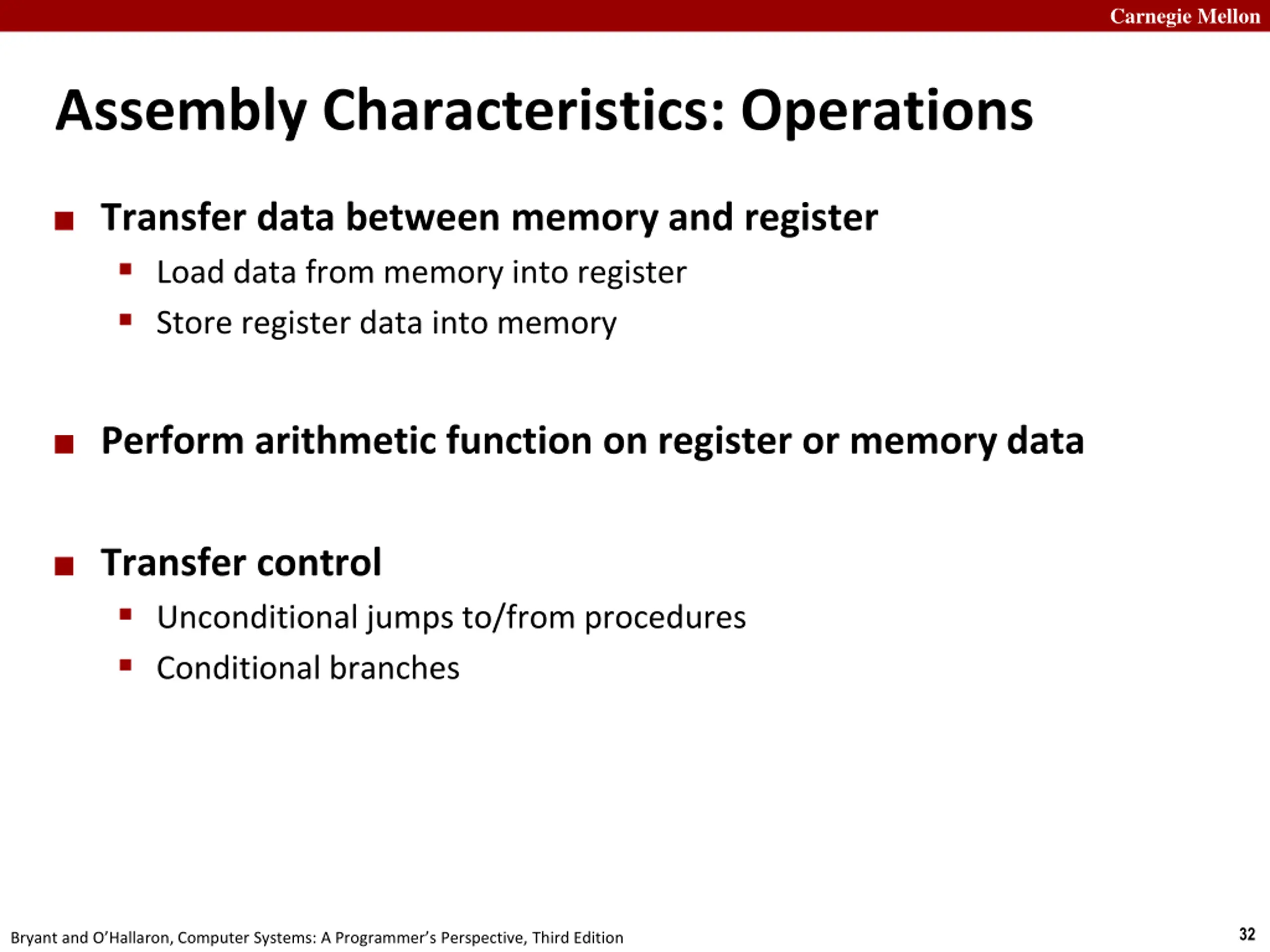 Carnegie Mellon Assembly Characteristics: Operations Transfer data between memory and register Load data from memory into register Store register data into memory Perform arithmetic function on register or memory data Transfer control Unconditional jumps to/from procedures Conditional branches 32 Bryant and O Hallaron, Computer Systems: A Programmer s Perspective, Third Edition