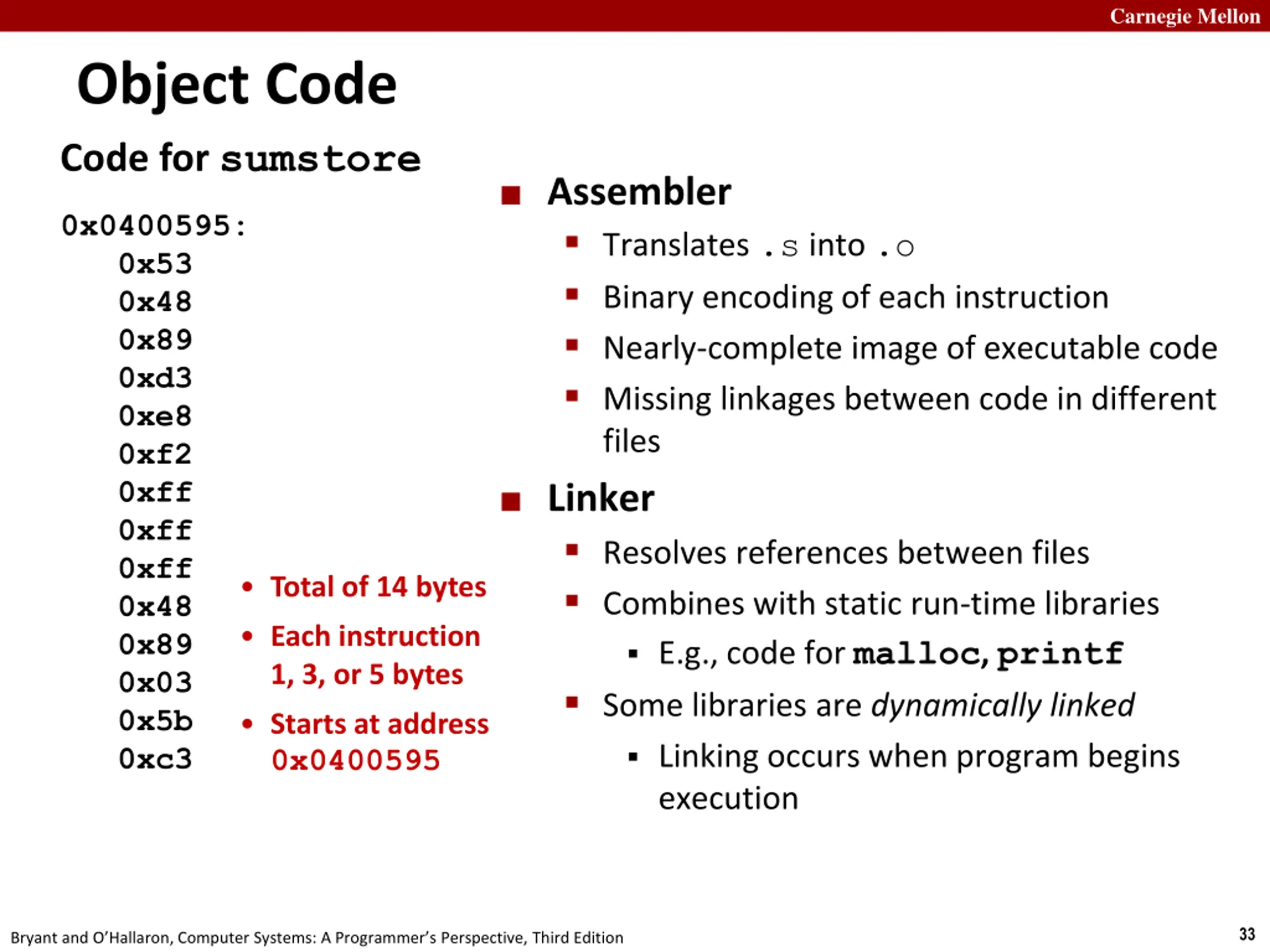 Carnegie Mellon Object Code Code for sumstore Assembler Translates .s into .o Binary encoding of each instruction Nearly-complete image of executable code Missing linkages between code in different files 0x0400595: 0x53 0x48 0x89 0xd3 0xe8 0xf2 0xff 0xff 0xff 0x48 0x89 0x03 0x5b 0xc3 Linker Resolves references between files Combines with static run-time libraries E.g., code for malloc, printf Some libraries are dynamically linked Total of 14 bytes Each instruction 1, 3, or 5 bytes Starts at address 0x0400595 Linking occurs when program begins execution 33 Bryant and O Hallaron, Computer Systems: A Programmer s Perspective, Third Edition