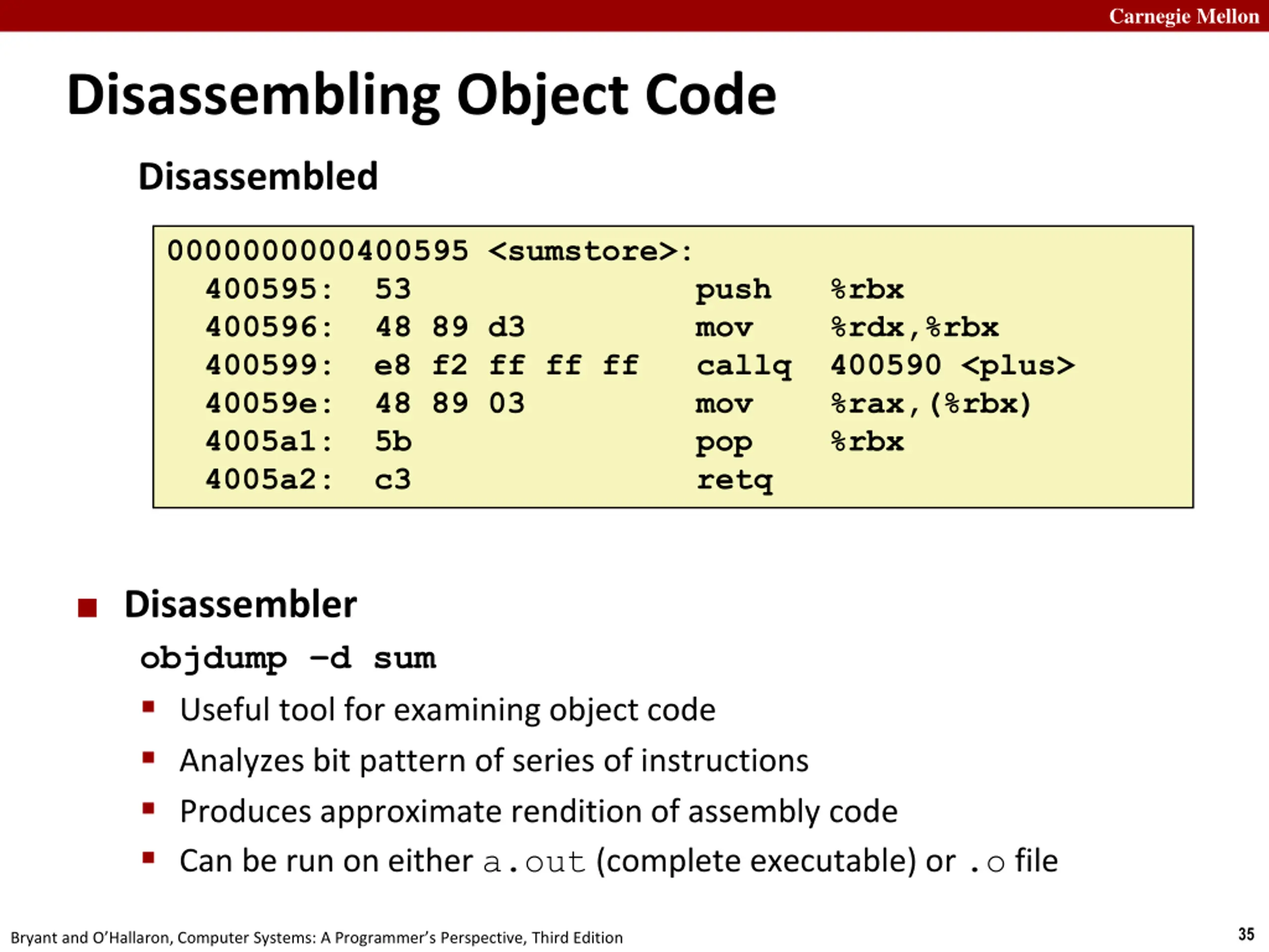 Carnegie Mellon Disassembling Object Code Disassembled 0000000000400595 <sumstore>: 400595: 53 push %rbx 400596: 48 89 d3 mov %rdx,%rbx 400599: e8 f2 ff ff ff callq 400590 <plus> 40059e: 48 89 03 mov %rax,(%rbx) 4005a1: 5b pop %rbx 4005a2: c3 retq Disassembler objdump d sum Useful tool for examining object code Analyzes bit pattern of series of instructions Produces approximate rendition of assembly code Can be run on either a.out (complete executable) or .o file 35 Bryant and O Hallaron, Computer Systems: A Programmer s Perspective, Third Edition