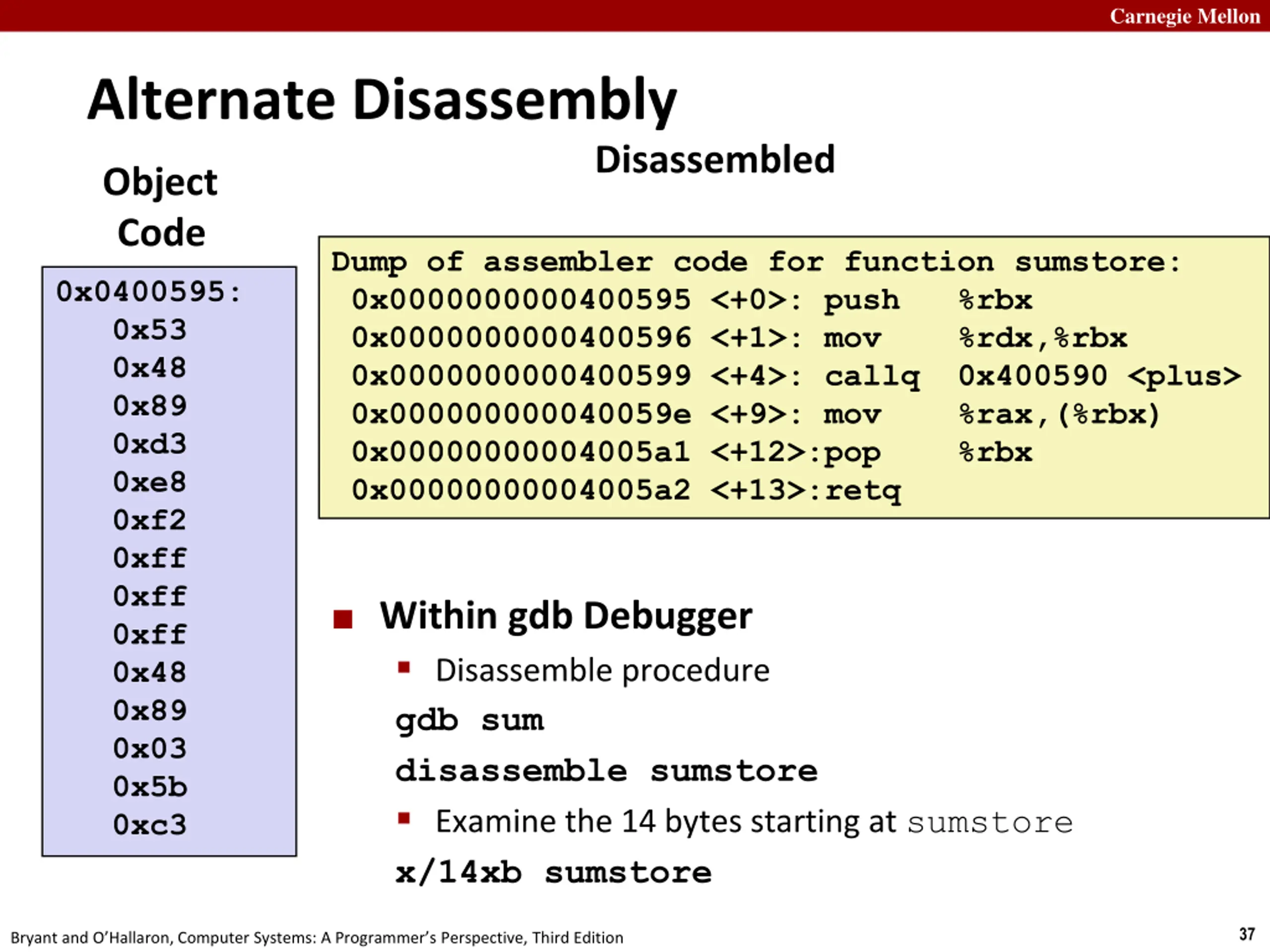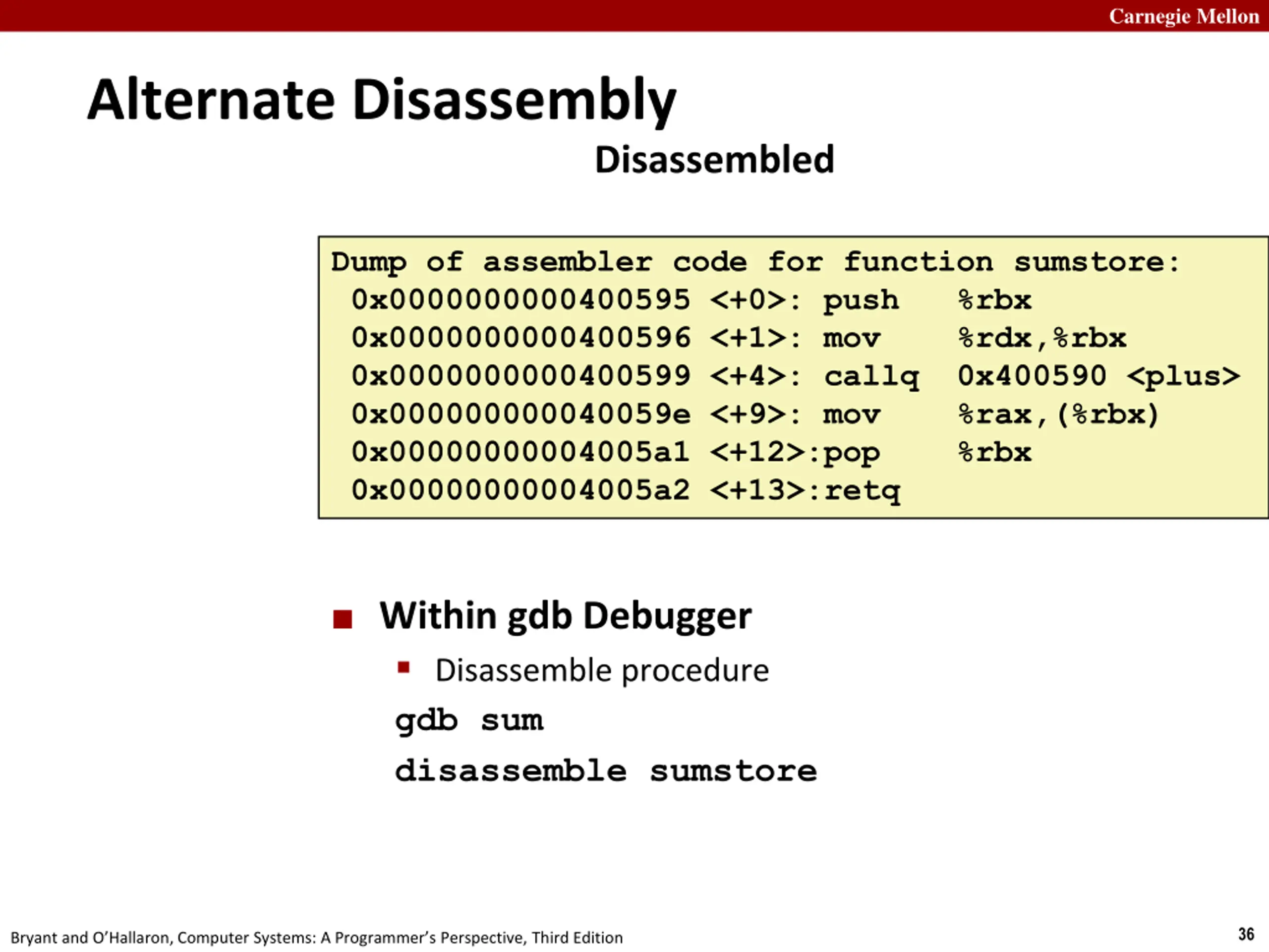 Carnegie Mellon Alternate Disassembly Disassembled Dump of assembler code for function sumstore: 0x0000000000400595 <+0>: push %rbx 0x0000000000400596 <+1>: mov %rdx,%rbx 0x0000000000400599 <+4>: callq 0x400590 <plus> 0x000000000040059e <+9>: mov %rax,(%rbx) 0x00000000004005a1 <+12>:pop %rbx 0x00000000004005a2 <+13>:retq Within gdb Debugger Disassemble procedure gdb sum disassemble sumstore 36 Bryant and O Hallaron, Computer Systems: A Programmer s Perspective, Third Edition