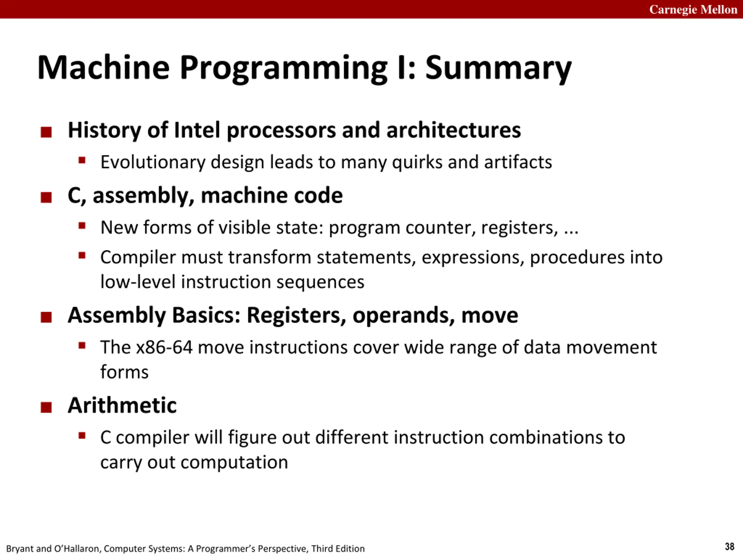 Carnegie Mellon Machine Programming I: Summary History of Intel processors and architectures Evolutionary design leads to many quirks and artifacts C, assembly, machine code New forms of visible state: program counter, registers, ... Compiler must transform statements, expressions, procedures into low-level instruction sequences Assembly Basics: Registers, operands, move The x86-64 move instructions cover wide range of data movement forms Arithmetic C compiler will figure out different instruction combinations to carry out computation 38 Bryant and O Hallaron, Computer Systems: A Programmer s Perspective, Third Edition