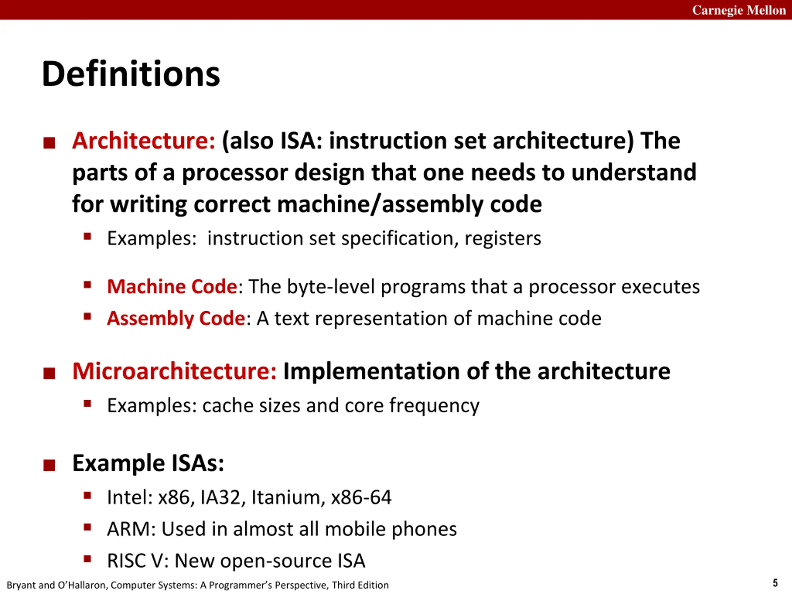 Carnegie Mellon Definitions Architecture: (also ISA: instruction set architecture) The parts of a processor design that one needs to understand for writing correct machine/assembly code Examples: instruction set specification, registers Machine Code: The byte-level programs that a processor executes Assembly Code: A text representation of machine code Microarchitecture: Implementation of the architecture Examples: cache sizes and core frequency Example ISAs: Intel: x86, IA32, Itanium, x86-64 ARM: Used in almost all mobile phones RISC V: New open-source ISA 5 Bryant and O Hallaron, Computer Systems: A Programmer s Perspective, Third Edition