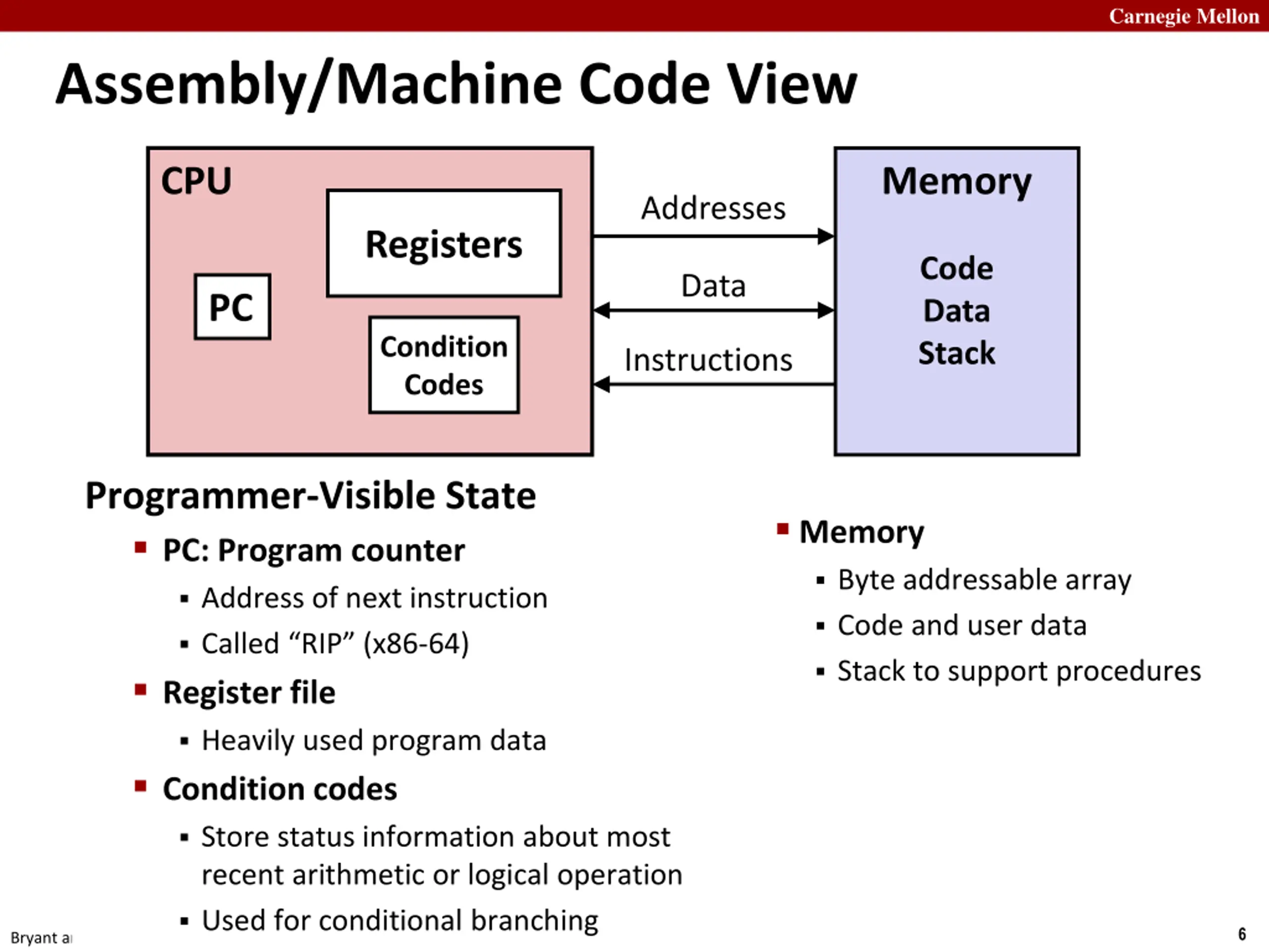 Carnegie Mellon Assembly/Machine Code View CPU Memory Addresses Registers Code Data Stack Data PC Condition Codes Instructions Programmer-Visible State PC: Program counter Memory Byte addressable array Address of next instruction Code and user data Called RIP (x86-64) Register file Stack to support procedures Heavily used program data Condition codes Store status information about most recent arithmetic or logical operation Used for conditional branching 6 Bryant and O Hallaron, Computer Systems: A Programmer s Perspective, Third Edition