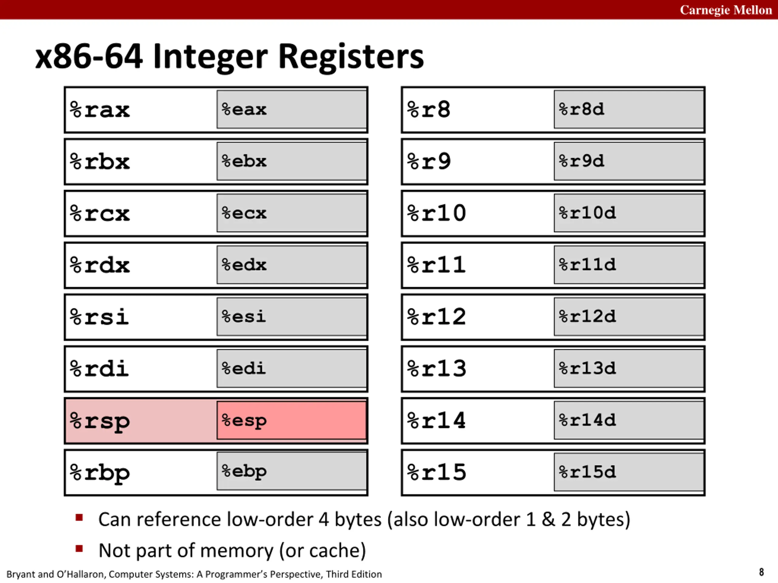 Carnegie Mellon x86-64 Integer Registers %rax %r8 %eax %r8d %rbx %r9 %ebx %r9d %rcx %r10 %ecx %r10d %rdx %r11 %edx %r11d %rsi %r12 %esi %r12d %rdi %r13 %edi %r13d %rsp %r14 %esp %r14d %rbp %r15 %ebp %r15d Can reference low-order 4 bytes (also low-order 1 & 2 bytes) Not part of memory (or cache) 8 Bryant and O Hallaron, Computer Systems: A Programmer s Perspective, Third Edition