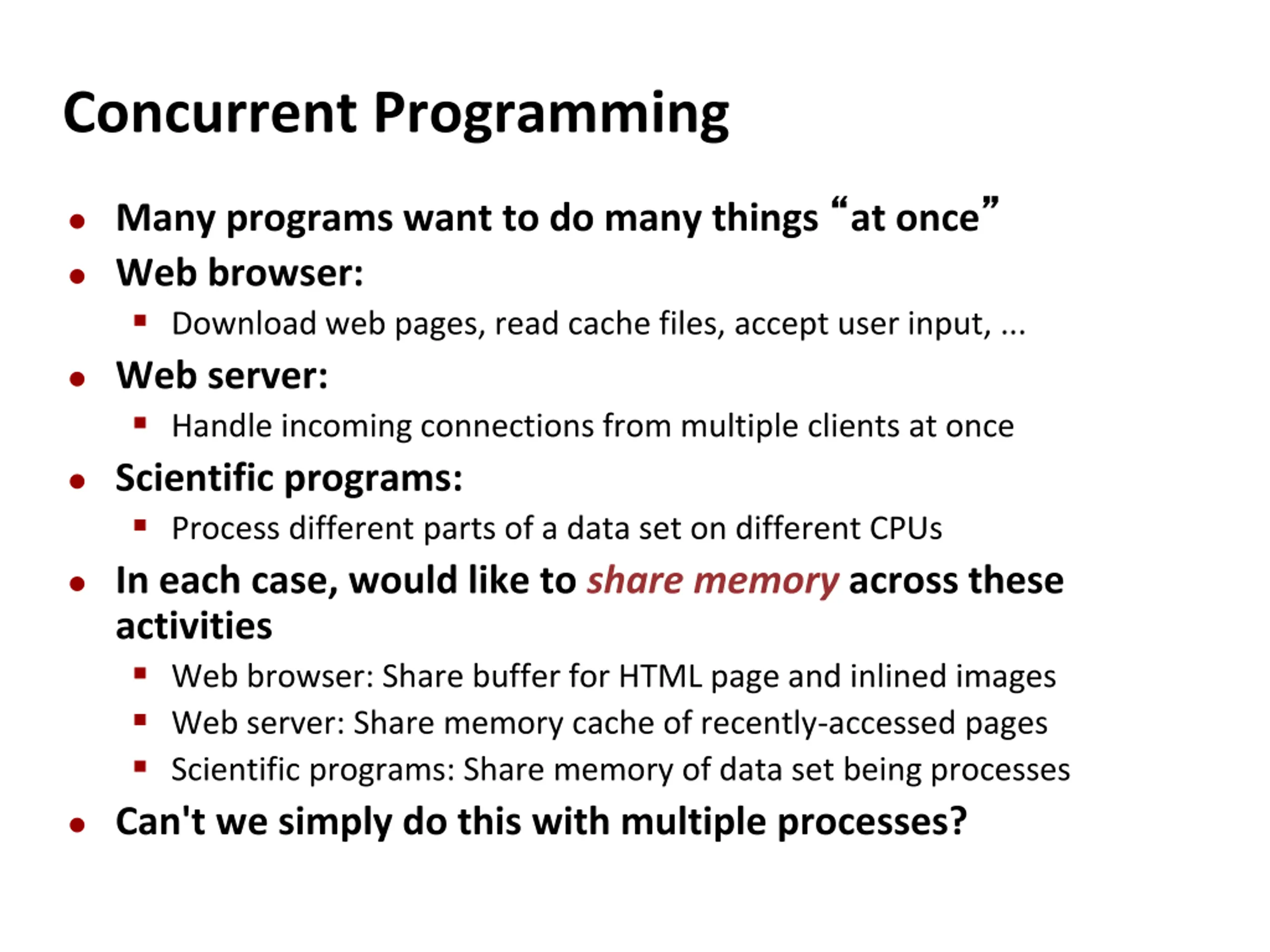 Carnegie Mellon Concurrent Programming Many programs want to do many things at once Web browser: Download web pages, read cache files, accept user input, ... Web server: Handle incoming connections from multiple clients at once Scientific programs: Process different parts of a data set on different CPUs In each case, would like to share memory across these activities Web browser: Share buffer for HTML page and inlined images Web server: Share memory cache of recently-accessed pages Scientific programs: Share memory of data set being processes Can't we simply do this with multiple processes?