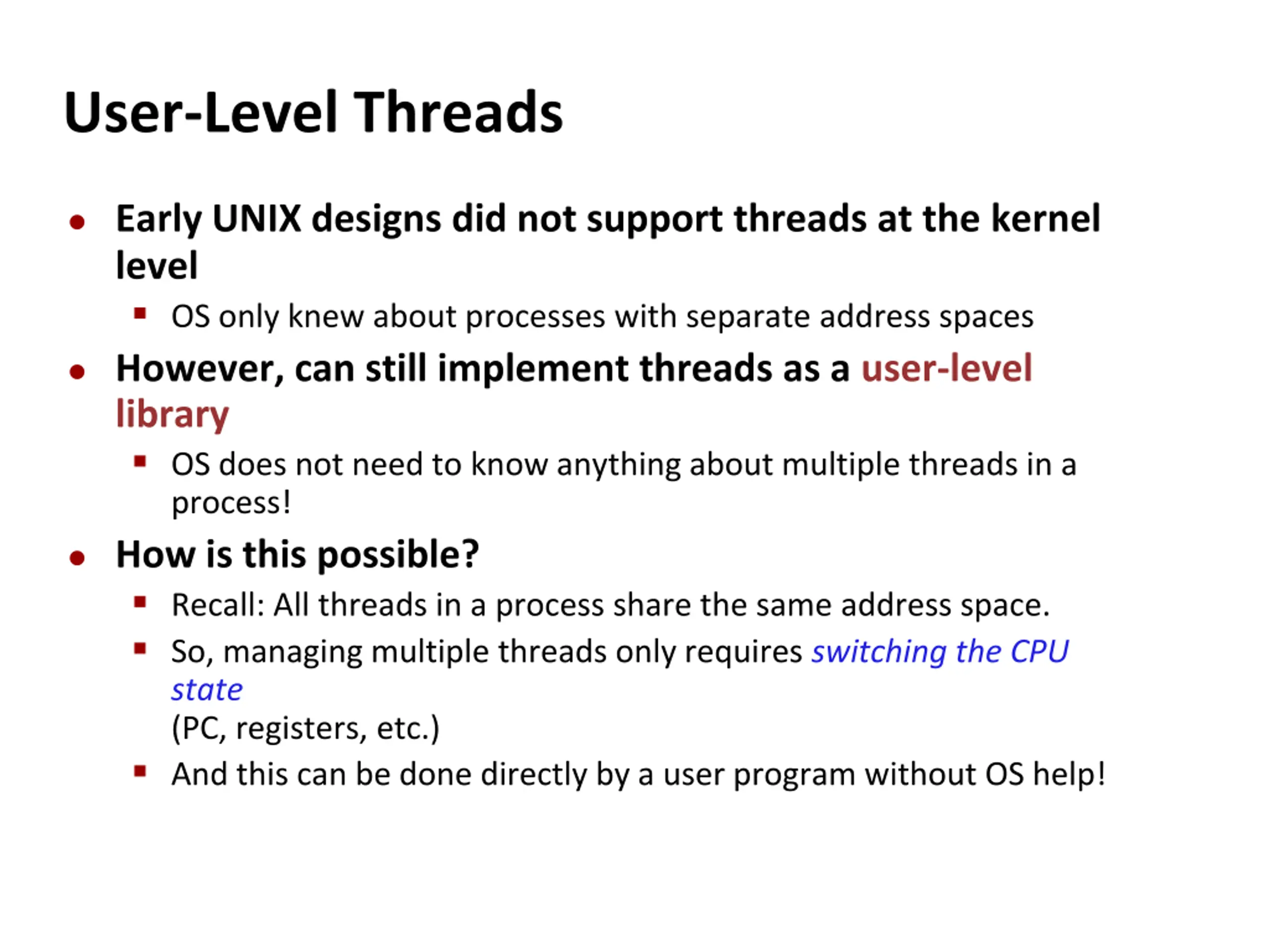 Carnegie Mellon User-Level Threads Early UNIX designs did not support threads at the kernel level OS only knew about processes with separate address spaces However, can still implement threads as a user-level library OS does not need to know anything about multiple threads in a process! How is this possible? Recall: All threads in a process share the same address space. So, managing multiple threads only requires switching the CPU state (PC, registers, etc.) And this can be done directly by a user program without OS help!