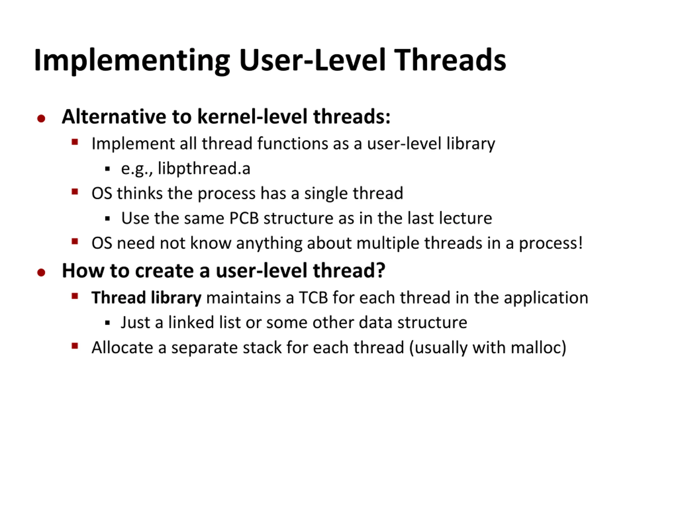 Carnegie Mellon Implementing User-Level Threads Alternative to kernel-level threads: Implement all thread functions as a user-level library e.g., libpthread.a OS thinks the process has a single thread Use the same PCB structure as in the last lecture OS need not know anything about multiple threads in a process! How to create a user-level thread? Thread library maintains a TCB for each thread in the application Just a linked list or some other data structure Allocate a separate stack for each thread (usually with malloc)