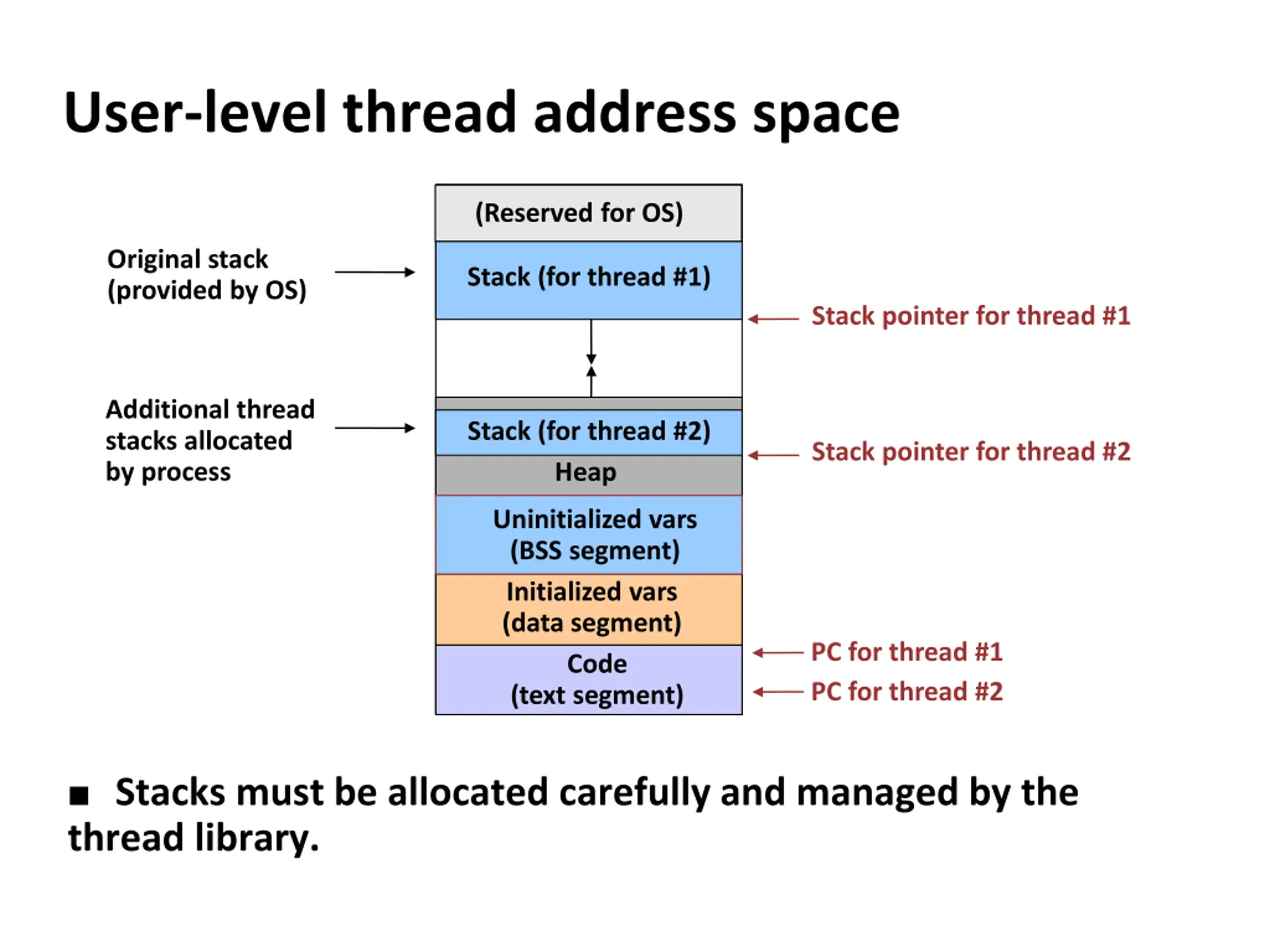Carnegie Mellon User-level thread address space (Reserved for OS) Original stack (provided by OS) Stack (for thread #1) Stack pointer for thread #1 Additional thread stacks allocated by process Stack (for thread #2) Stack pointer for thread #2 Heap Uninitialized vars (BSS segment) Initialized vars (data segment) Code (text segment) PC for thread #1 PC for thread #2 Stacks must be allocated carefully and managed by the thread library.