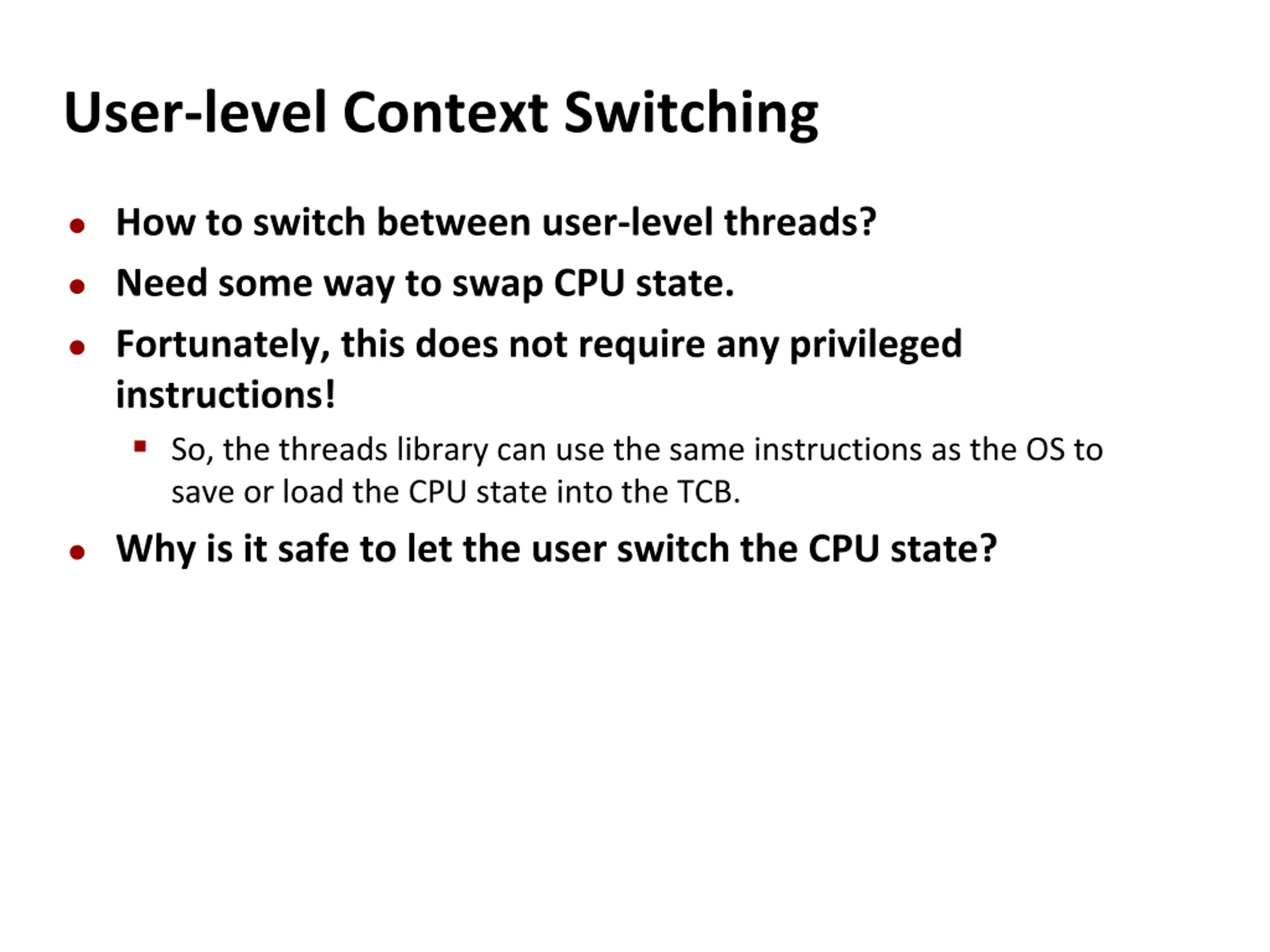 Carnegie Mellon User-level Context Switching How to switch between user-level threads? Need some way to swap CPU state. Fortunately, this does not require any privileged instructions! So, the threads library can use the same instructions as the OS to save or load the CPU state into the TCB. Why is it safe to let the user switch the CPU state?