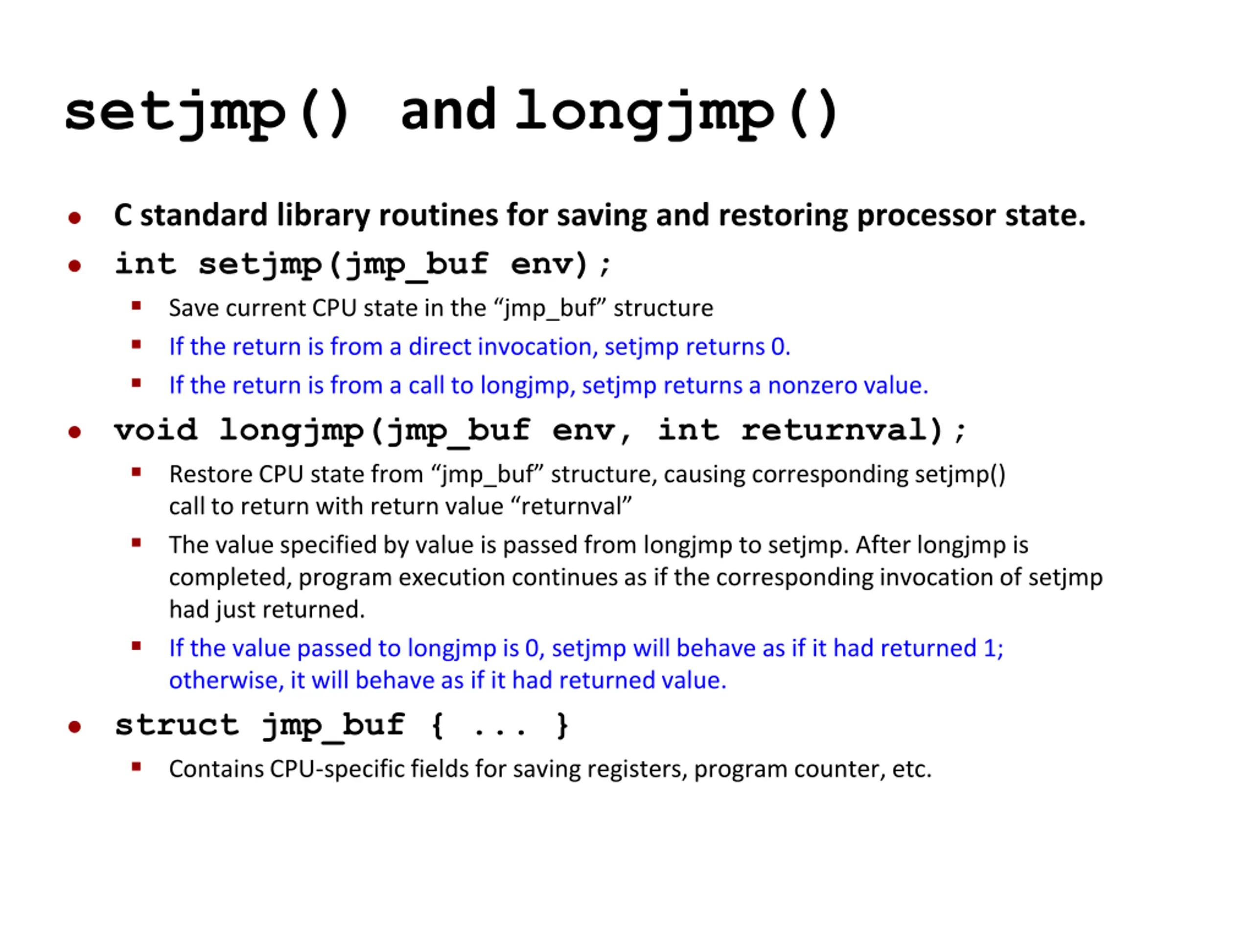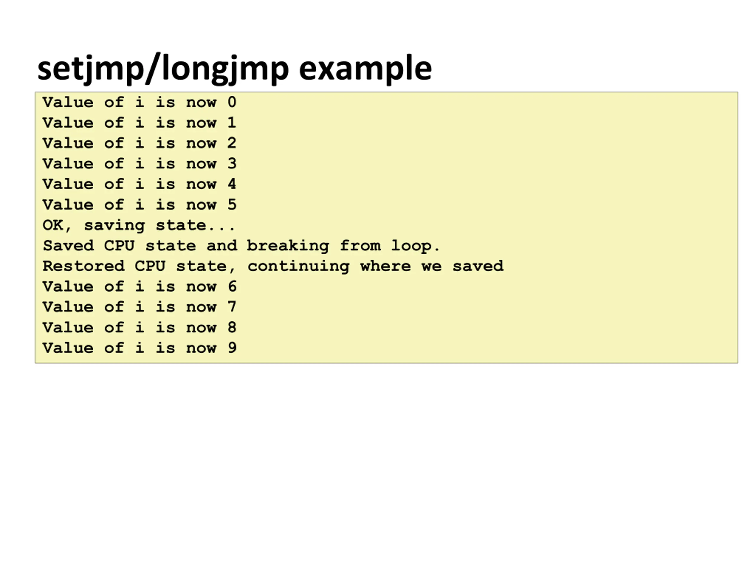 Carnegie Mellon setjmp/longjmp example Value of i is now 0 Value of i is now 1 Value of i is now 2 Value of i is now 3 Value of i is now 4 Value of i is now 5 OK, saving state... Saved CPU state and breaking from loop. Restored CPU state, continuing where we saved Value of i is now 6 Value of i is now 7 Value of i is now 8 Value of i is now 9
