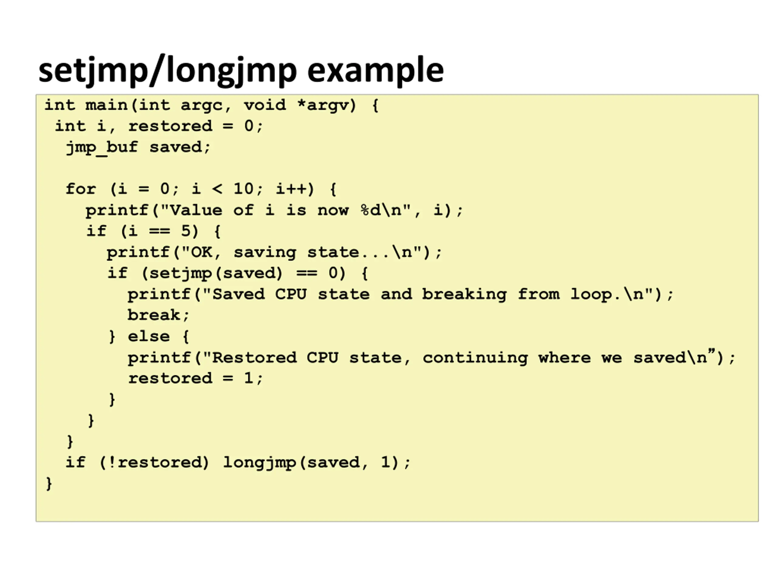 Carnegie Mellon setjmp/longjmp example int main(int argc, void *argv) { int i, restored = 0; jmp_buf saved; for (i = 0; i < 10; i++) { printf("Value of i is now %d\n", i); if (i == 5) { printf("OK, saving state...\n"); if (setjmp(saved) == 0) { printf("Saved CPU state and breaking from loop.\n"); break; } else { printf("Restored CPU state, continuing where we saved\n ); restored = 1; } } } if (!restored) longjmp(saved, 1); }