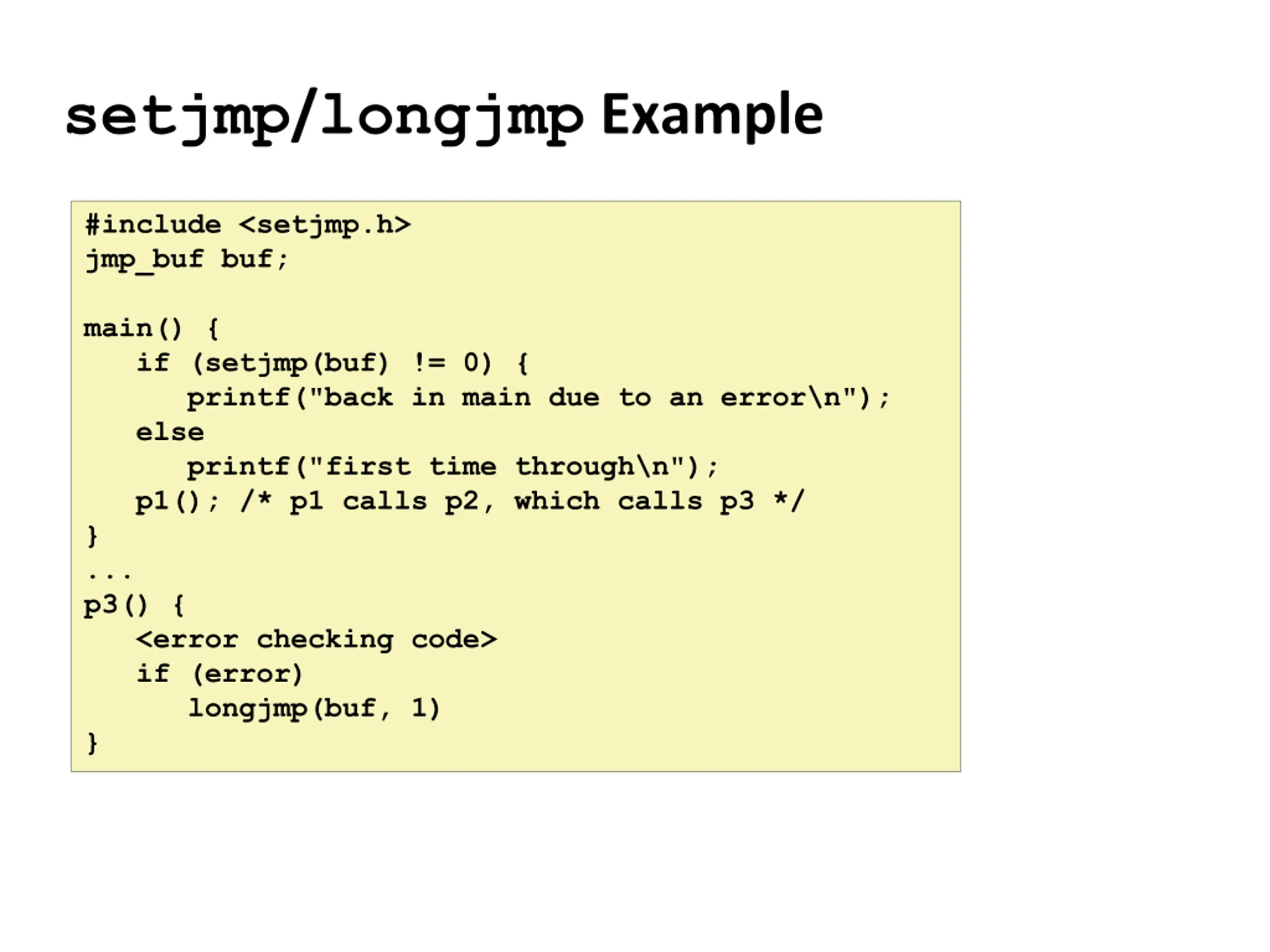 Carnegie Mellon setjmp/longjmp Example #include <setjmp.h> jmp_buf buf; main() { if (setjmp(buf) != 0) { printf("back in main due to an error\n"); else printf("first time through\n"); p1(); /* p1 calls p2, which calls p3 */ } ... p3() { <error checking code> if (error) longjmp(buf, 1) }
