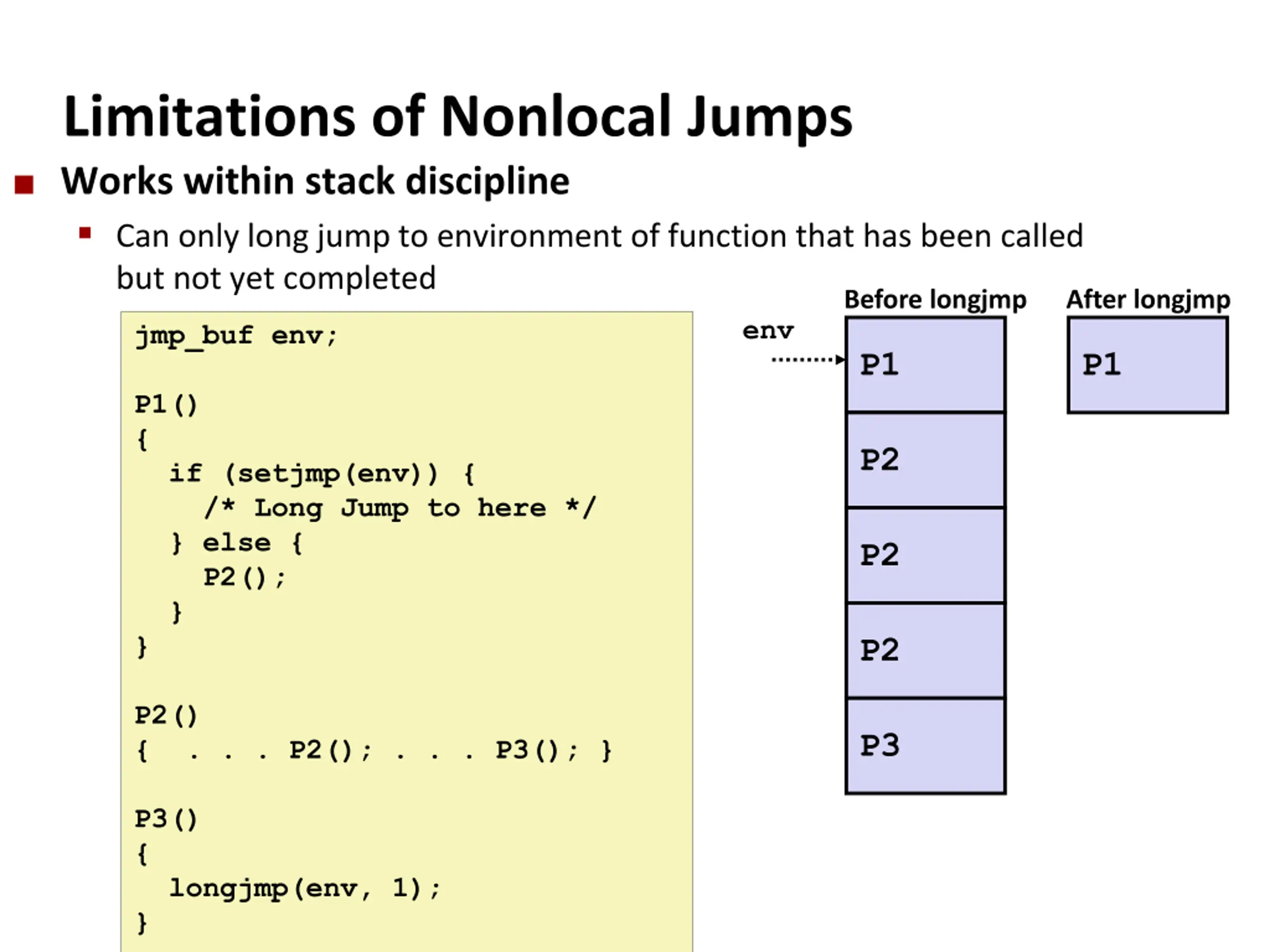 Carnegie Mellon Limitations of Nonlocal Jumps Works within stack discipline Can only long jump to environment of function that has been called but not yet completed Before longjmp After longjmp env jmp_buf env; P1 P1 P1() { if (setjmp(env)) { /* Long Jump to here */ } else { P2(); } } P2 P2 P2 P2() { . . . P2(); . . . P3(); } P3 P3() { longjmp(env, 1); }