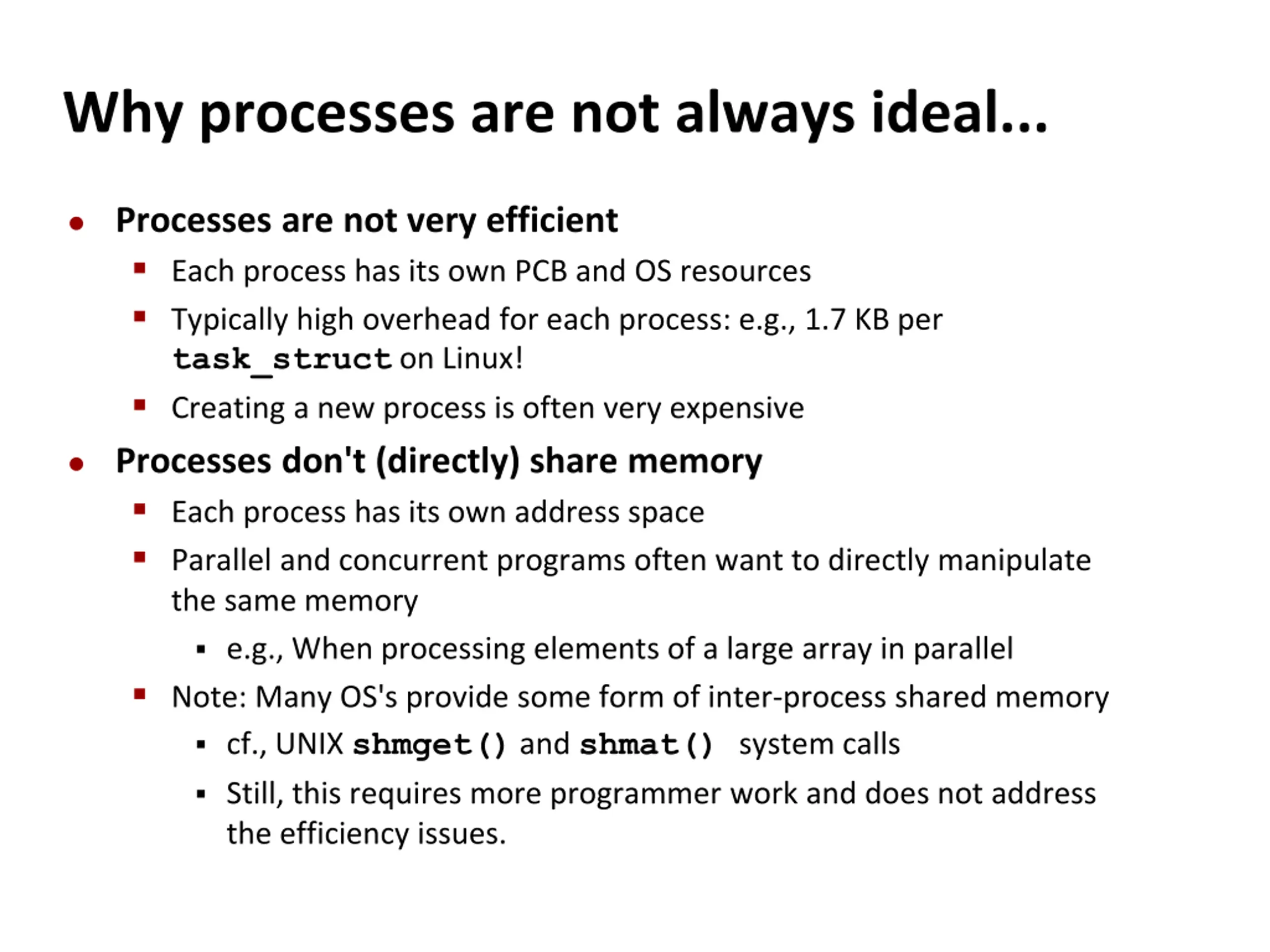 Carnegie Mellon Why processes are not always ideal... Processes are not very efficient Each process has its own PCB and OS resources Typically high overhead for each process: e.g., 1.7 KB per task_struct on Linux! Creating a new process is often very expensive Processes don't (directly) share memory Each process has its own address space Parallel and concurrent programs often want to directly manipulate the same memory e.g., When processing elements of a large array in parallel Note: Many OS's provide some form of inter-process shared memory cf., UNIX shmget() and shmat() system calls Still, this requires more programmer work and does not address the efficiency issues.
