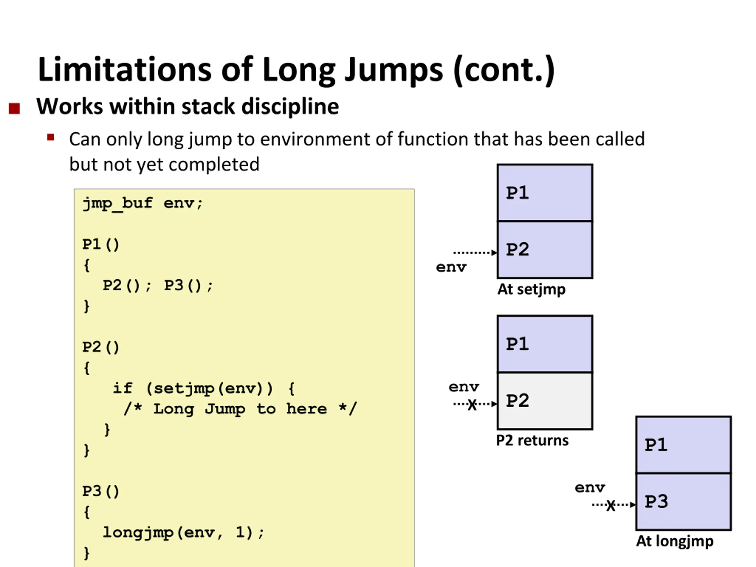 Carnegie Mellon Limitations of Long Jumps (cont.) Works within stack discipline Can only long jump to environment of function that has been called but not yet completed P1 jmp_buf env; P1() { P2(); P3(); } P2 env At setjmp P1 P2() { if (setjmp(env)) { /* Long Jump to here */ } } env P2 X P2 returns P1 env P3() { longjmp(env, 1); } P3 X At longjmp