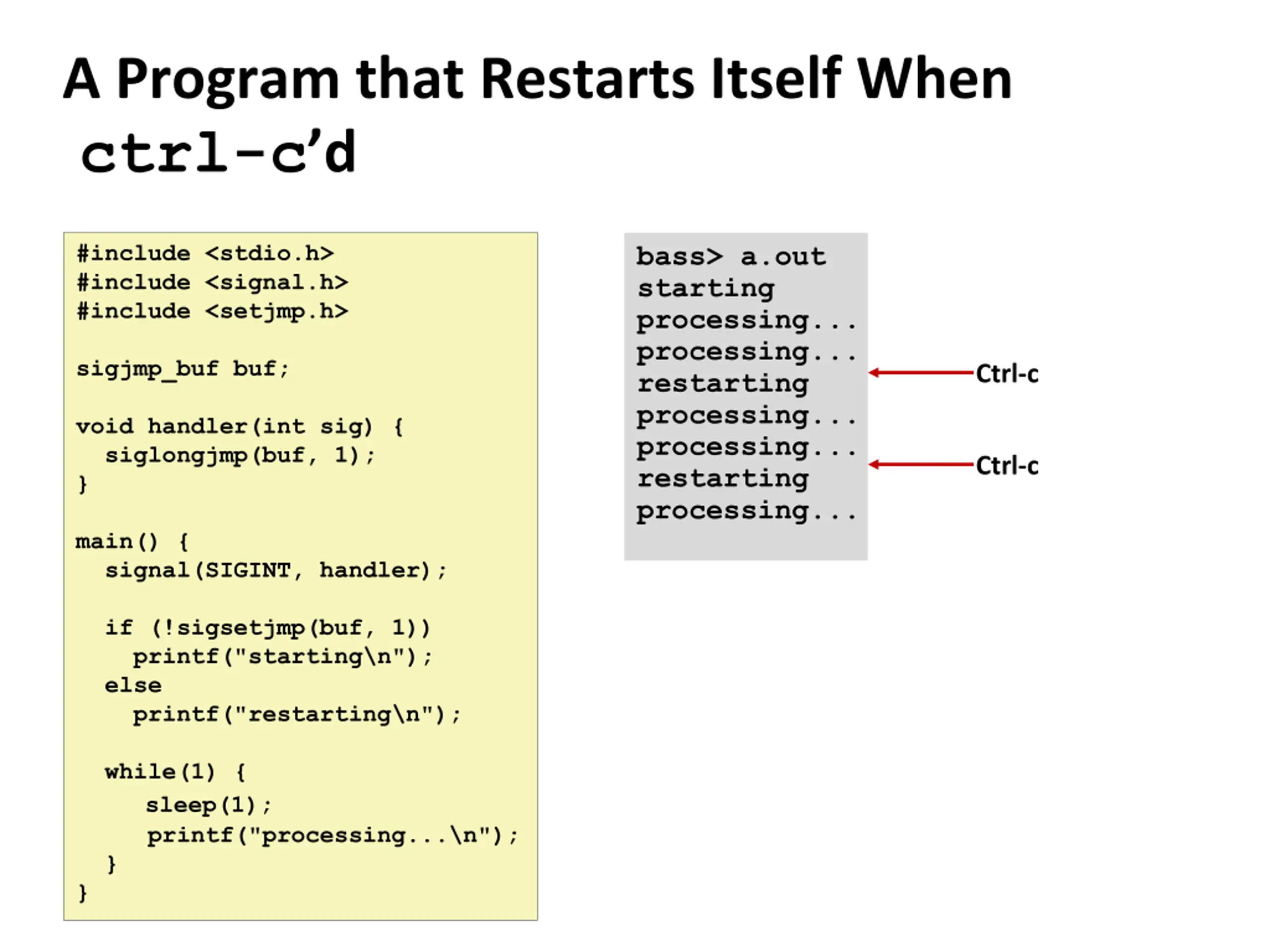 Carnegie Mellon A Program that Restarts Itself When ctrl-c d #include <stdio.h> #include <signal.h> #include <setjmp.h> bass> a.out starting processing... processing... restarting processing... processing... restarting processing... sigjmp_buf buf; void handler(int sig) { siglongjmp(buf, 1); } main() { signal(SIGINT, handler); if (!sigsetjmp(buf, 1)) printf("starting\n"); else printf("restarting\n"); Ctrl-c Ctrl-c while(1) { sleep(1); printf("processing...\n"); } }