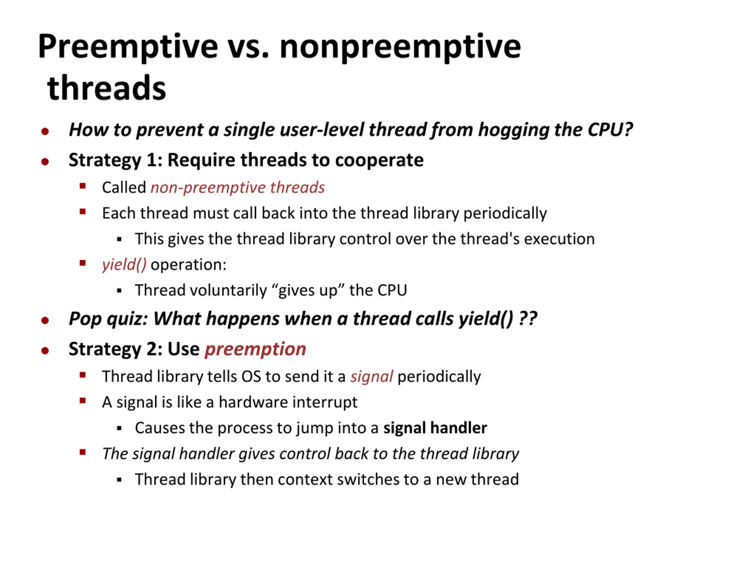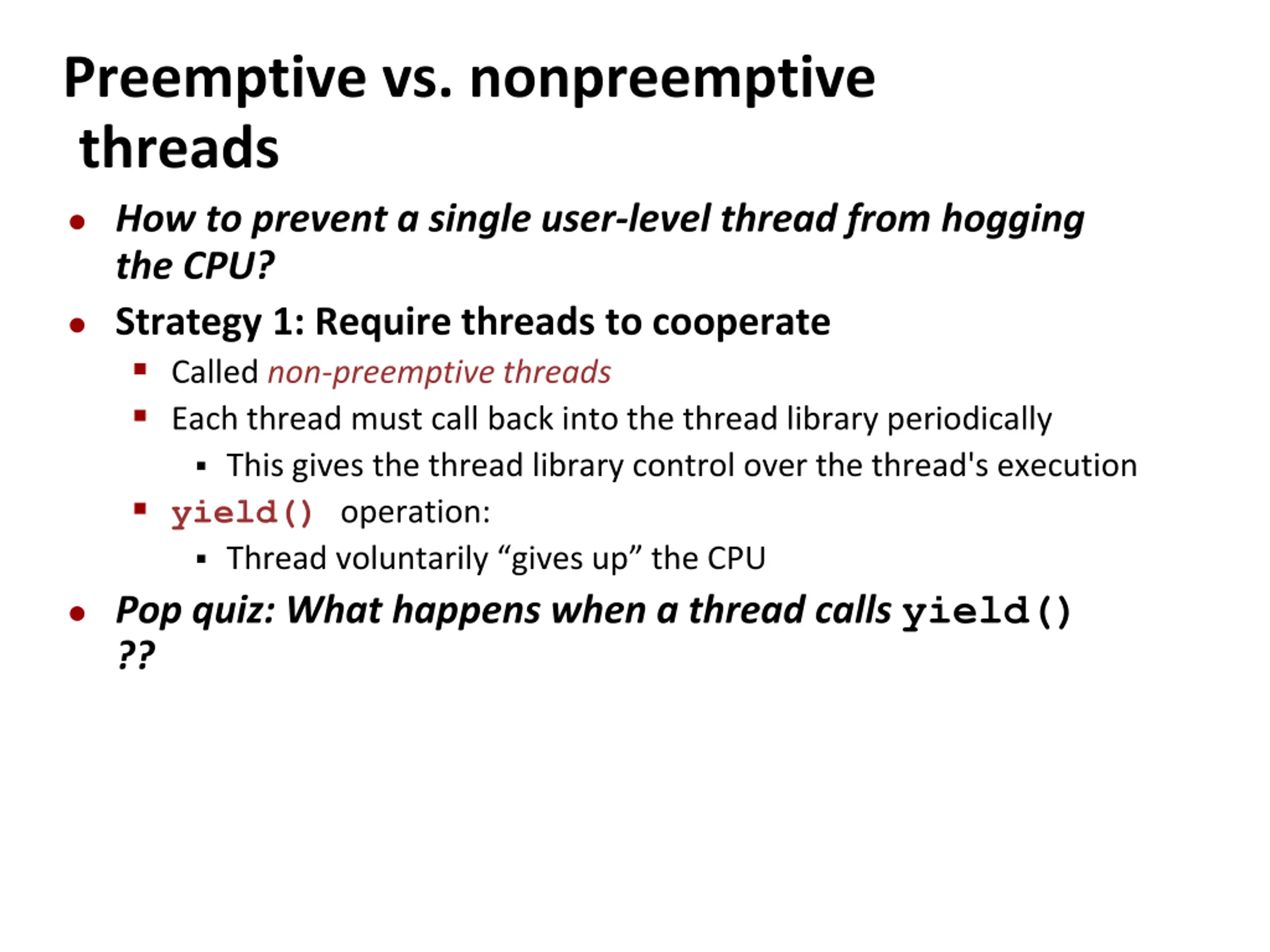 Carnegie Mellon Preemptive vs. nonpreemptive threads How to prevent a single user-level thread from hogging the CPU? Strategy 1: Require threads to cooperate Called non-preemptive threads Each thread must call back into the thread library periodically This gives the thread library control over the thread's execution yield() operation: Thread voluntarily gives up the CPU Pop quiz: What happens when a thread calls yield() ??