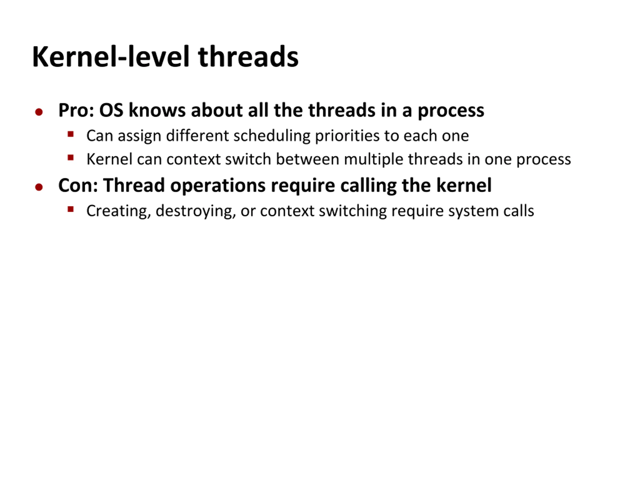 Carnegie Mellon Kernel-level threads Pro: OS knows about all the threads in a process Can assign different scheduling priorities to each one Kernel can context switch between multiple threads in one process Con: Thread operations require calling the kernel Creating, destroying, or context switching require system calls