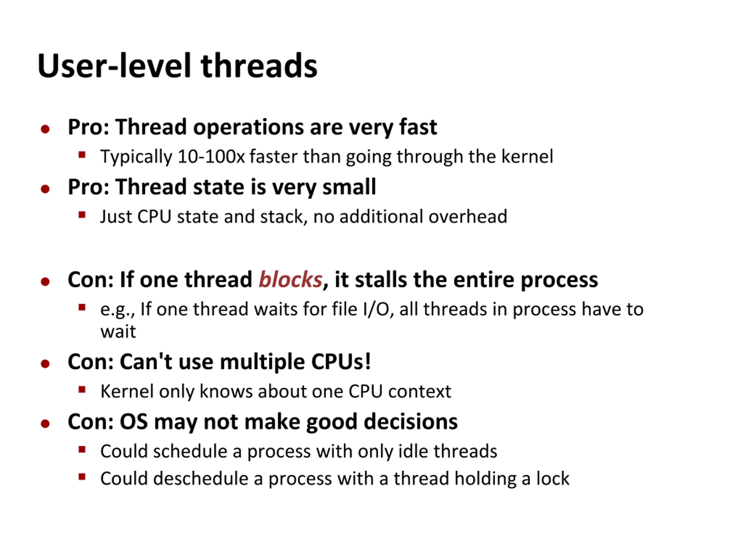 Carnegie Mellon User-level threads Pro: Thread operations are very fast Typically 10-100x faster than going through the kernel Pro: Thread state is very small Just CPU state and stack, no additional overhead Con: If one thread blocks, it stalls the entire process e.g., If one thread waits for file I/O, all threads in process have to wait Con: Can't use multiple CPUs! Kernel only knows about one CPU context Con: OS may not make good decisions Could schedule a process with only idle threads Could deschedule a process with a thread holding a lock