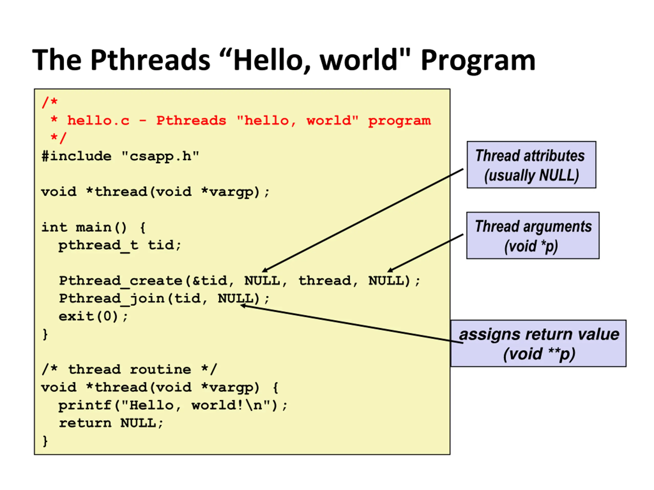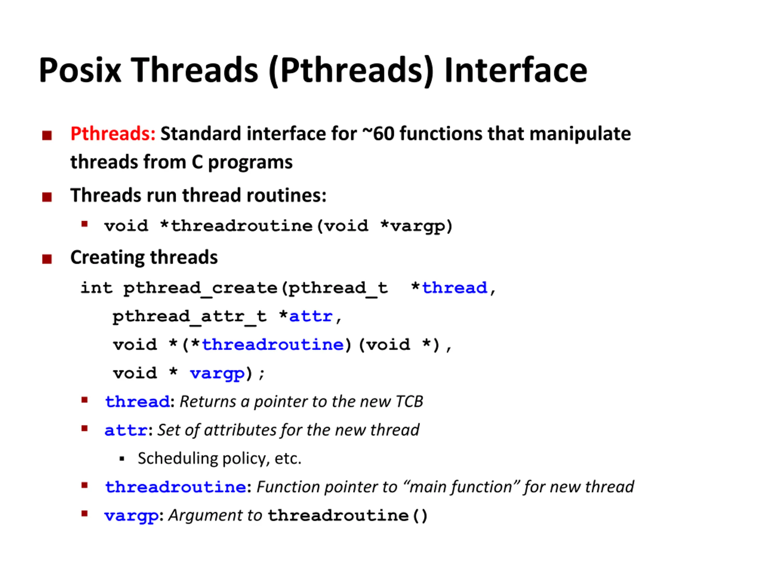 Carnegie Mellon Posix Threads (Pthreads) Interface Pthreads: Standard interface for ~60 functions that manipulate threads from C programs Threads run thread routines: void *threadroutine(void *vargp) Creating threads int pthread_create(pthread_t *thread, pthread_attr_t *attr, void *(*threadroutine)(void *), void * vargp); thread: Returns a pointer to the new TCB attr: Set of attributes for the new thread Scheduling policy, etc. threadroutine: Function pointer to main function for new thread vargp: Argument to threadroutine()