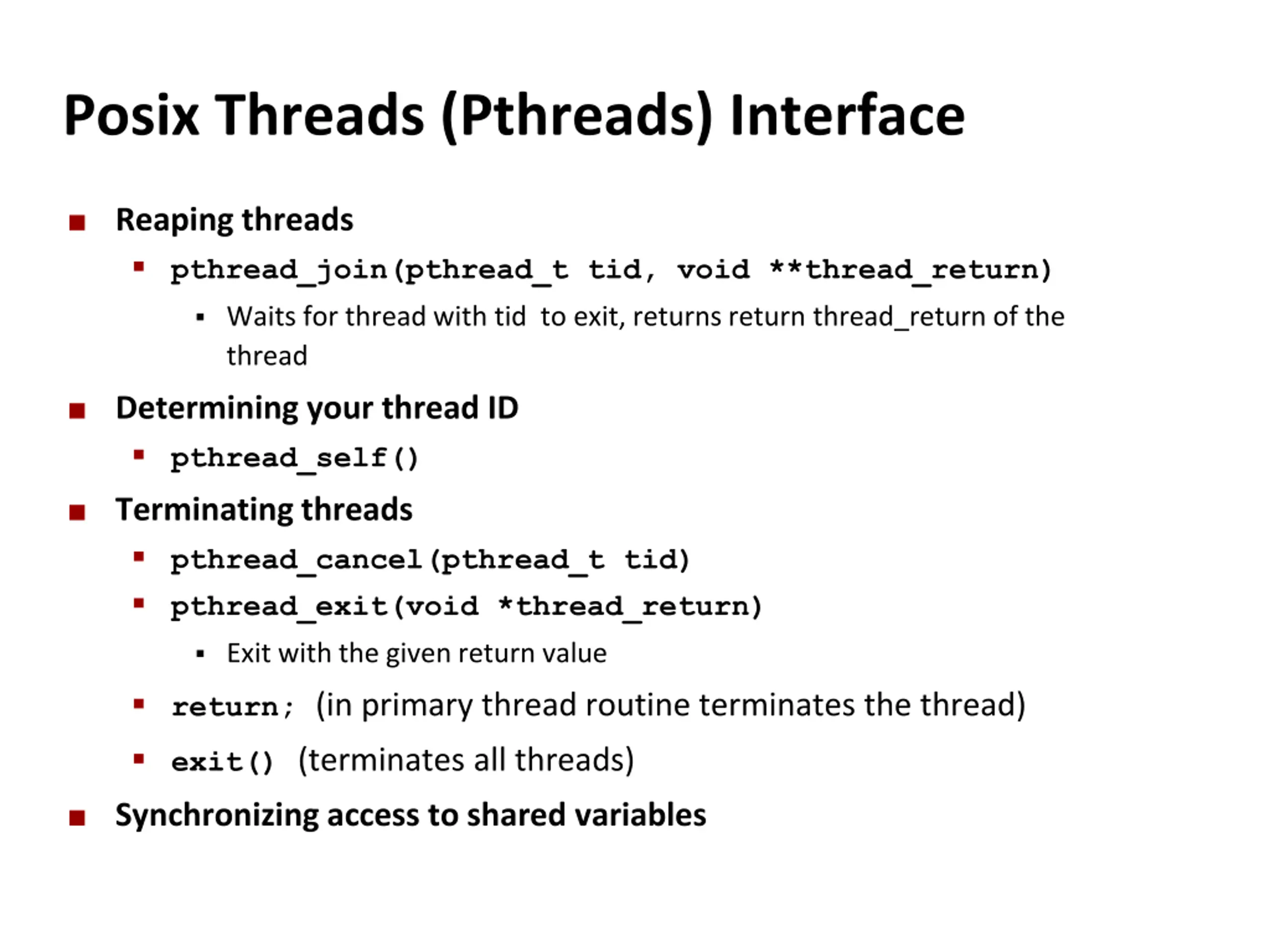 Carnegie Mellon Posix Threads (Pthreads) Interface Reaping threads pthread_join(pthread_t tid, void **thread_return) Waits for thread with tid to exit, returns return thread_return of the thread Determining your thread ID pthread_self() Terminating threads pthread_cancel(pthread_t tid) pthread_exit(void *thread_return) Exit with the given return value return; (in primary thread routine terminates the thread) exit() (terminates all threads) Synchronizing access to shared variables