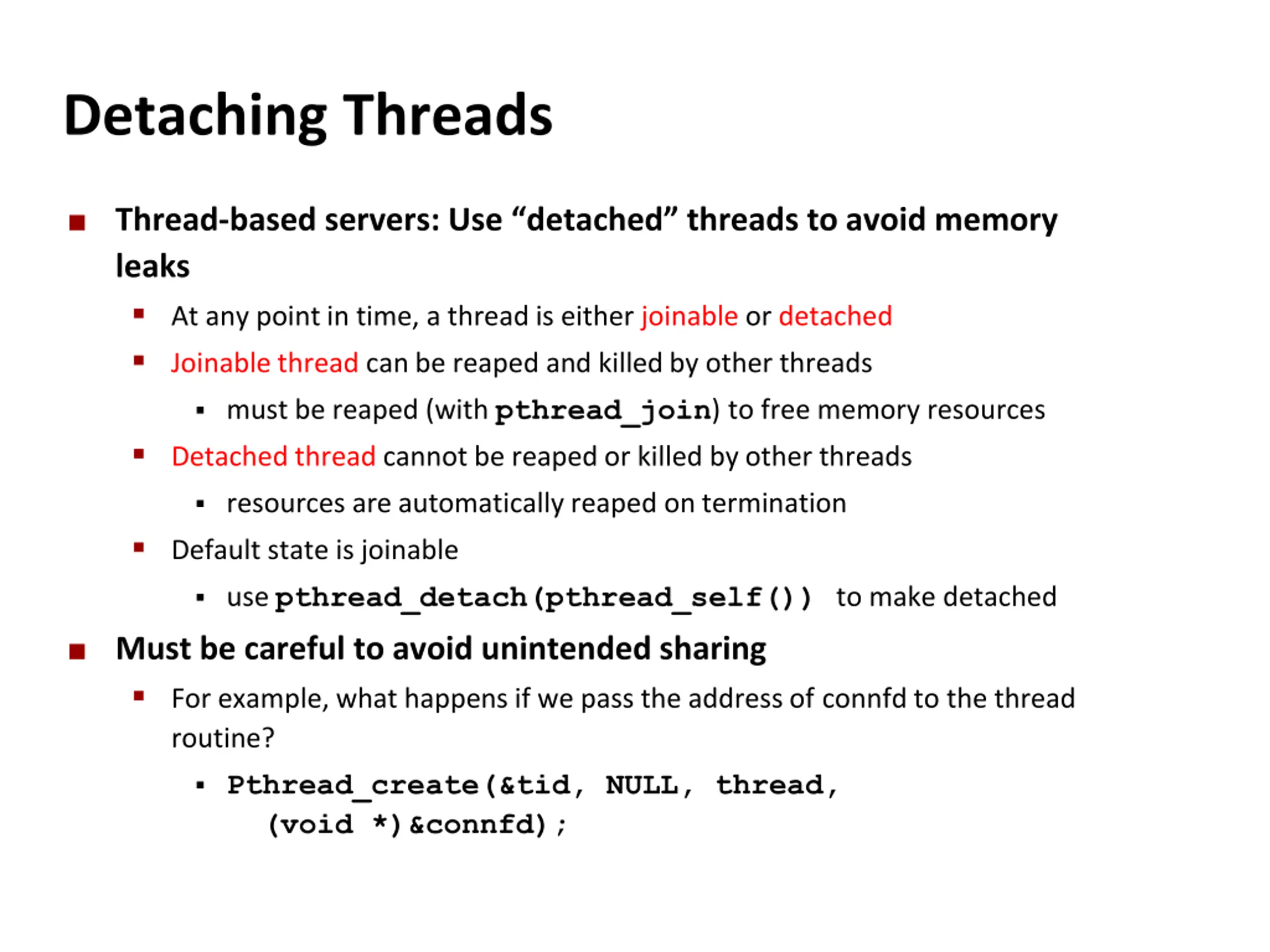 Carnegie Mellon Detaching Threads Thread-based servers: Use detached threads to avoid memory leaks At any point in time, a thread is either joinable or detached Joinable thread can be reaped and killed by other threads must be reaped (with pthread_join) to free memory resources Detached thread cannot be reaped or killed by other threads resources are automatically reaped on termination Default state is joinable use pthread_detach(pthread_self()) to make detached Must be careful to avoid unintended sharing For example, what happens if we pass the address of connfd to the thread routine? Pthread_create(&tid, NULL, thread, (void *)&connfd);