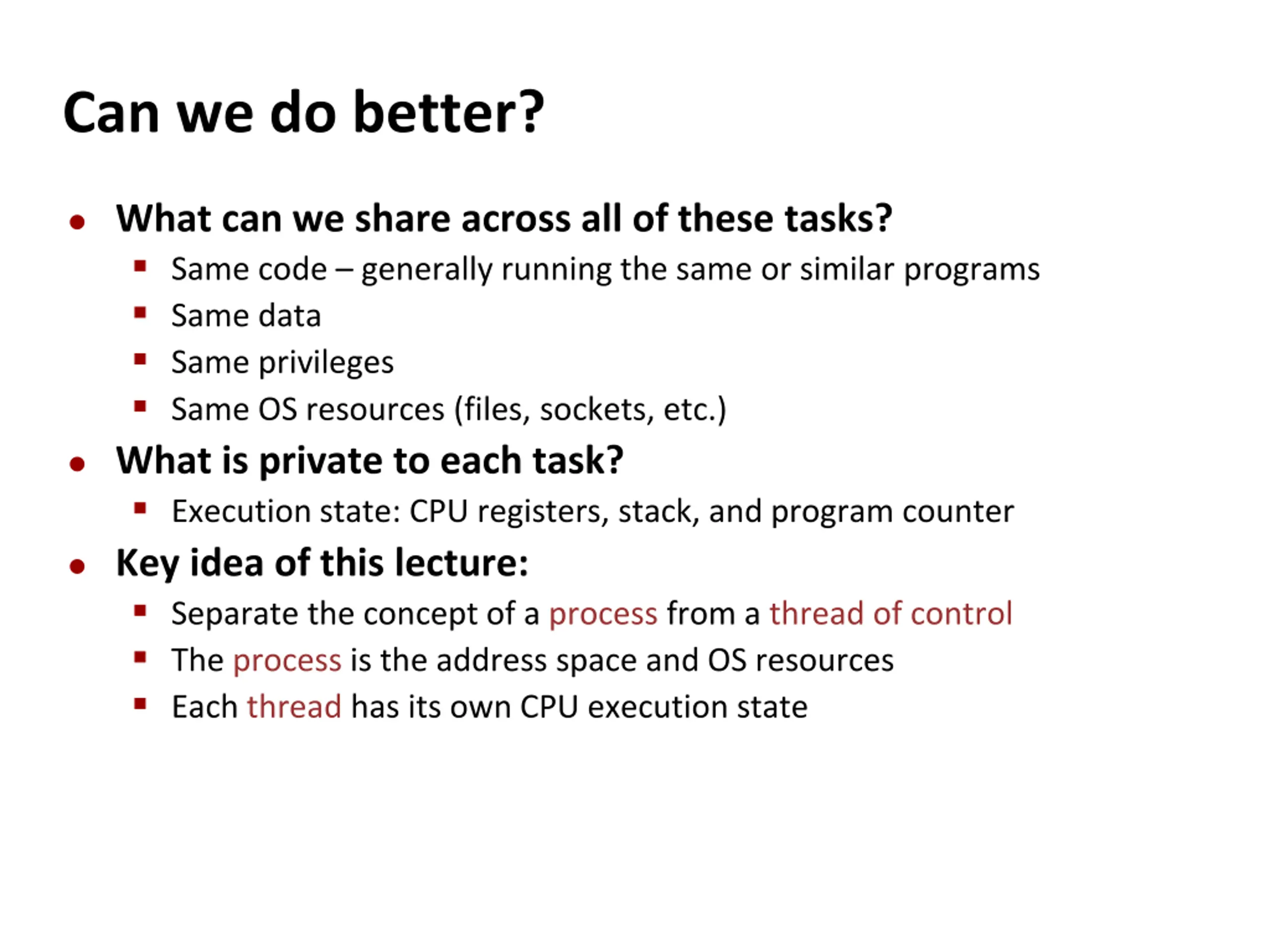 Carnegie Mellon Can we do better? What can we share across all of these tasks? Same code generally running the same or similar programs Same data Same privileges Same OS resources (files, sockets, etc.) What is private to each task? Execution state: CPU registers, stack, and program counter Key idea of this lecture: Separate the concept of a process from a thread of control The process is the address space and OS resources Each thread has its own CPU execution state
