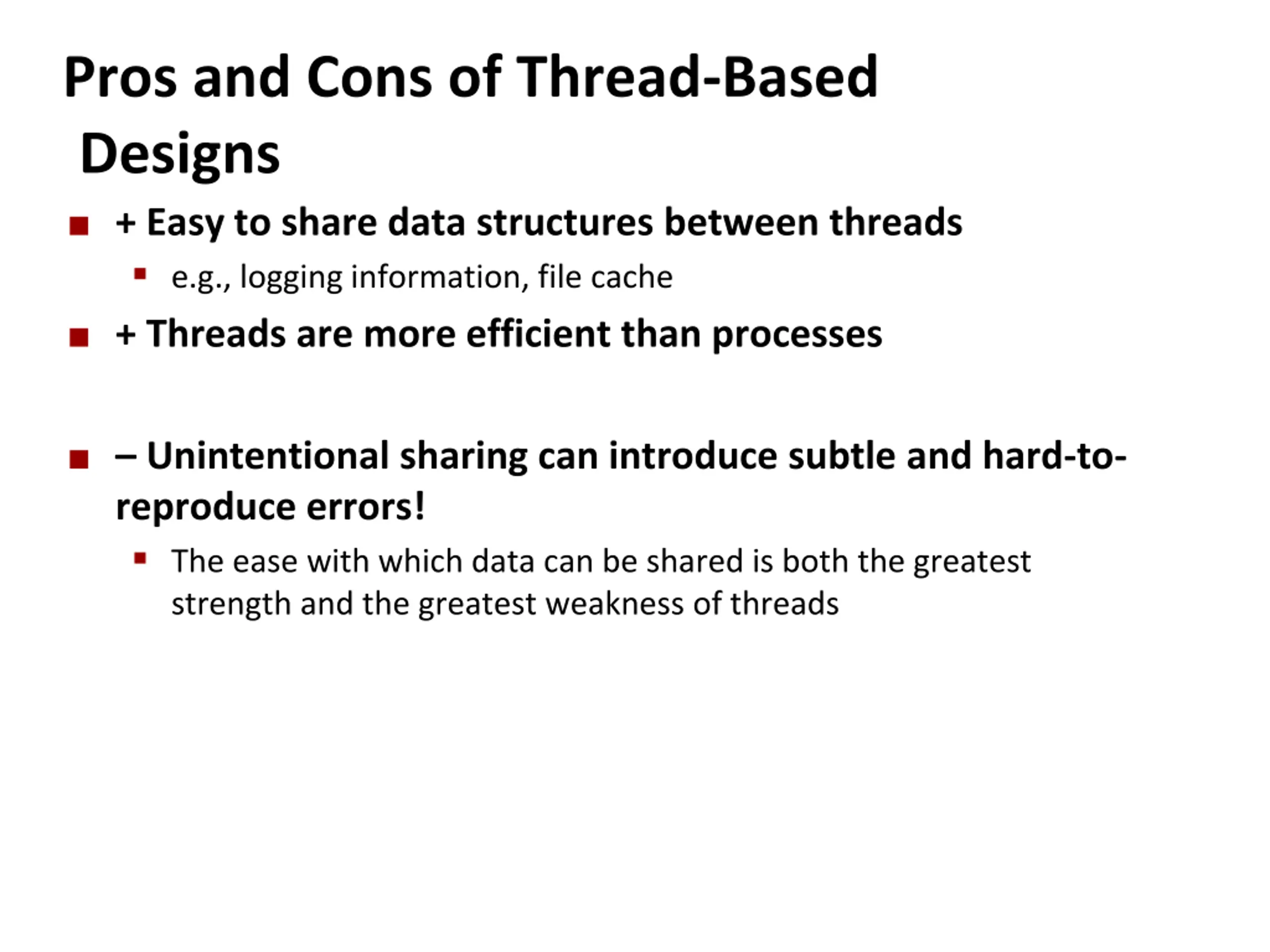 Carnegie Mellon Pros and Cons of Thread-Based Designs + Easy to share data structures between threads e.g., logging information, file cache + Threads are more efficient than processes Unintentional sharing can introduce subtle and hard-to- reproduce errors! The ease with which data can be shared is both the greatest strength and the greatest weakness of threads