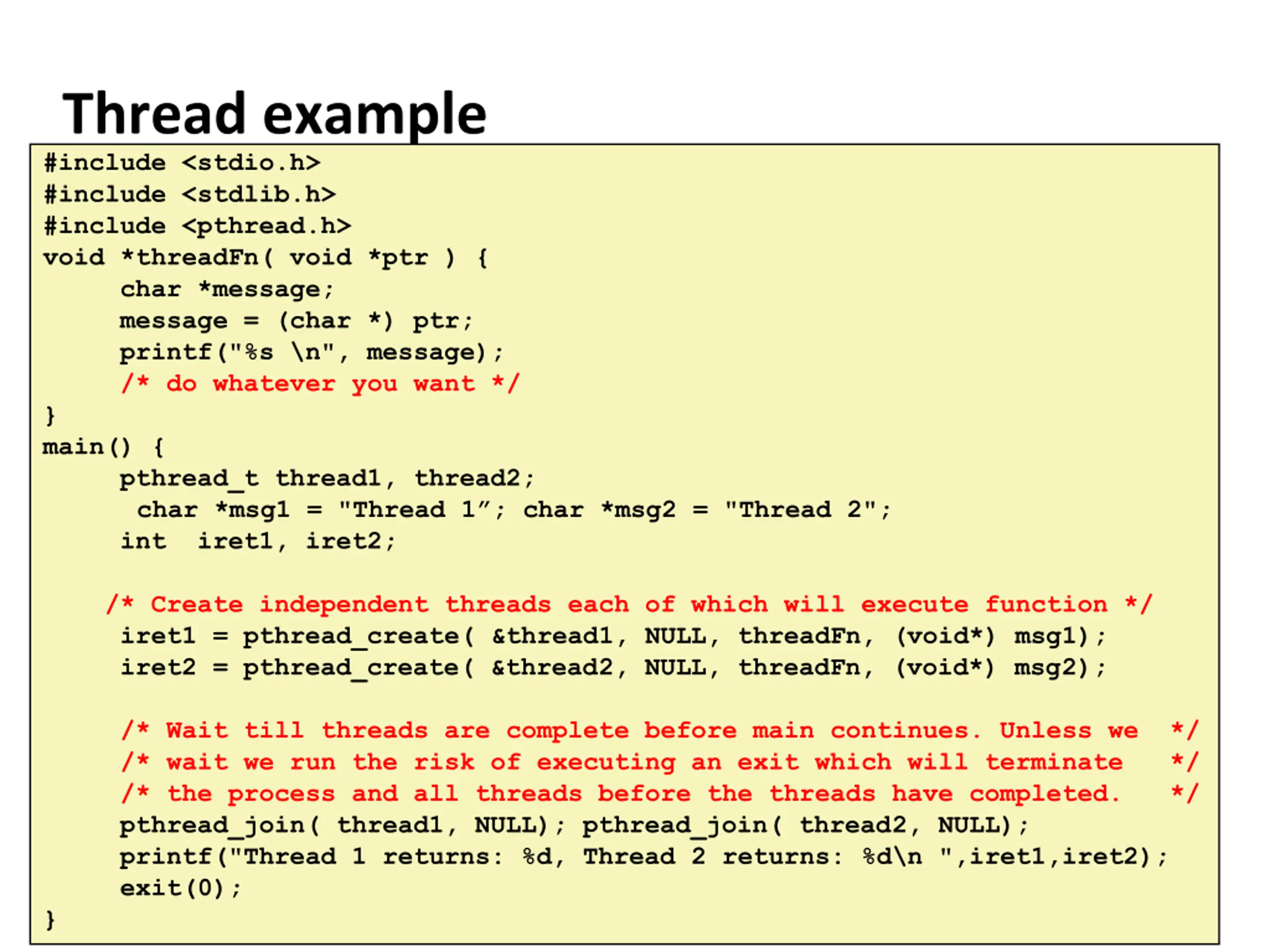 Carnegie Mellon Thread example #include <stdio.h> #include <stdlib.h> #include <pthread.h> void *threadFn( void *ptr ) { char *message; message = (char *) ptr; printf("%s \n", message); /* do whatever you want */ } main() { pthread_t thread1, thread2; char *msg1 = "Thread 1 ; char *msg2 = "Thread 2"; int iret1, iret2; /* Create independent threads each of which will execute function */ iret1 = pthread_create( &thread1, NULL, threadFn, (void*) msg1); iret2 = pthread_create( &thread2, NULL, threadFn, (void*) msg2); /* Wait till threads are complete before main continues. Unless we */ /* wait we run the risk of executing an exit which will terminate */ /* the process and all threads before the threads have completed. */ pthread_join( thread1, NULL); pthread_join( thread2, NULL); printf("Thread 1 returns: %d, Thread 2 returns: %d\n ",iret1,iret2); exit(0); }