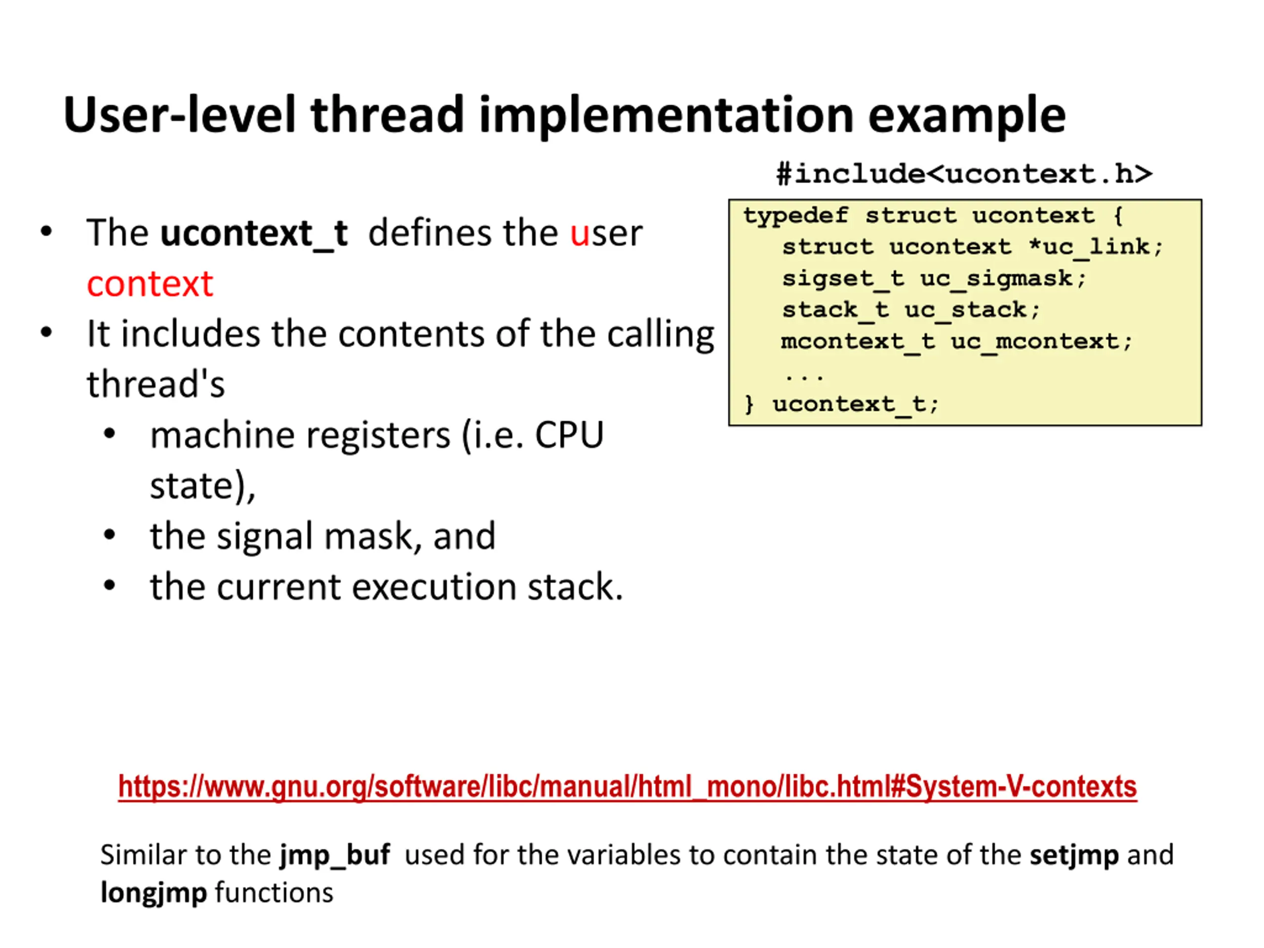 Carnegie Mellon User-level thread implementation example #include<ucontext.h> typedef struct ucontext { struct ucontext *uc_link; sigset_t uc_sigmask; stack_t uc_stack; mcontext_t uc_mcontext; ... } ucontext_t; The ucontext_t defines the user context It includes the contents of the calling thread's machine registers (i.e. CPU state), the signal mask, and the current execution stack. https://www.gnu.org/software/libc/manual/html_mono/libc.html#System-V-contexts Similar to the jmp_buf used for the variables to contain the state of the setjmp and longjmp functions