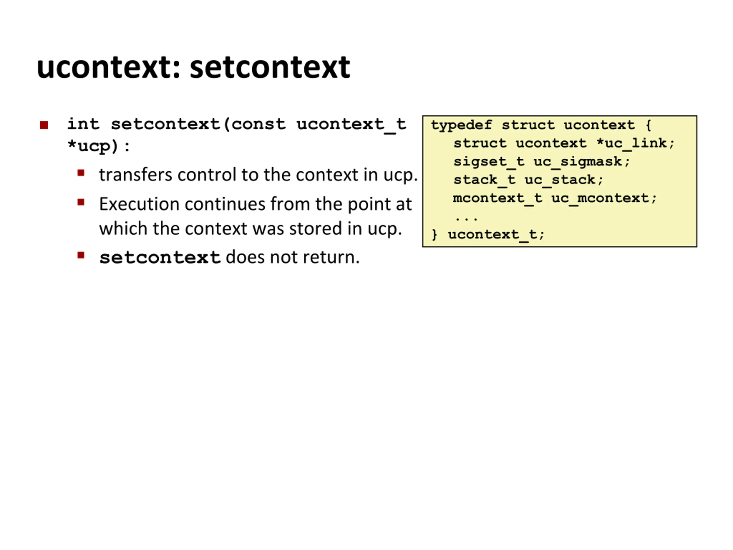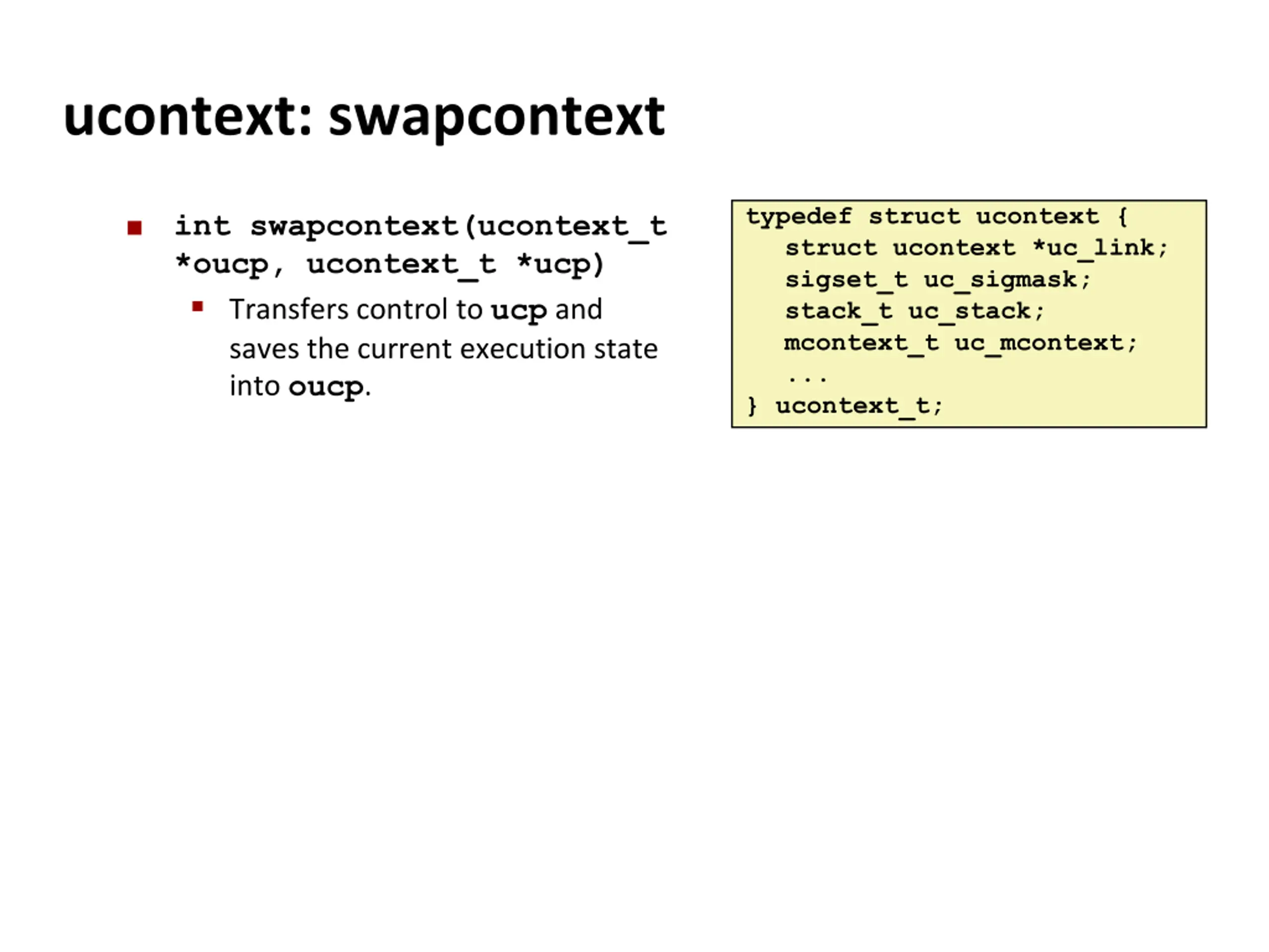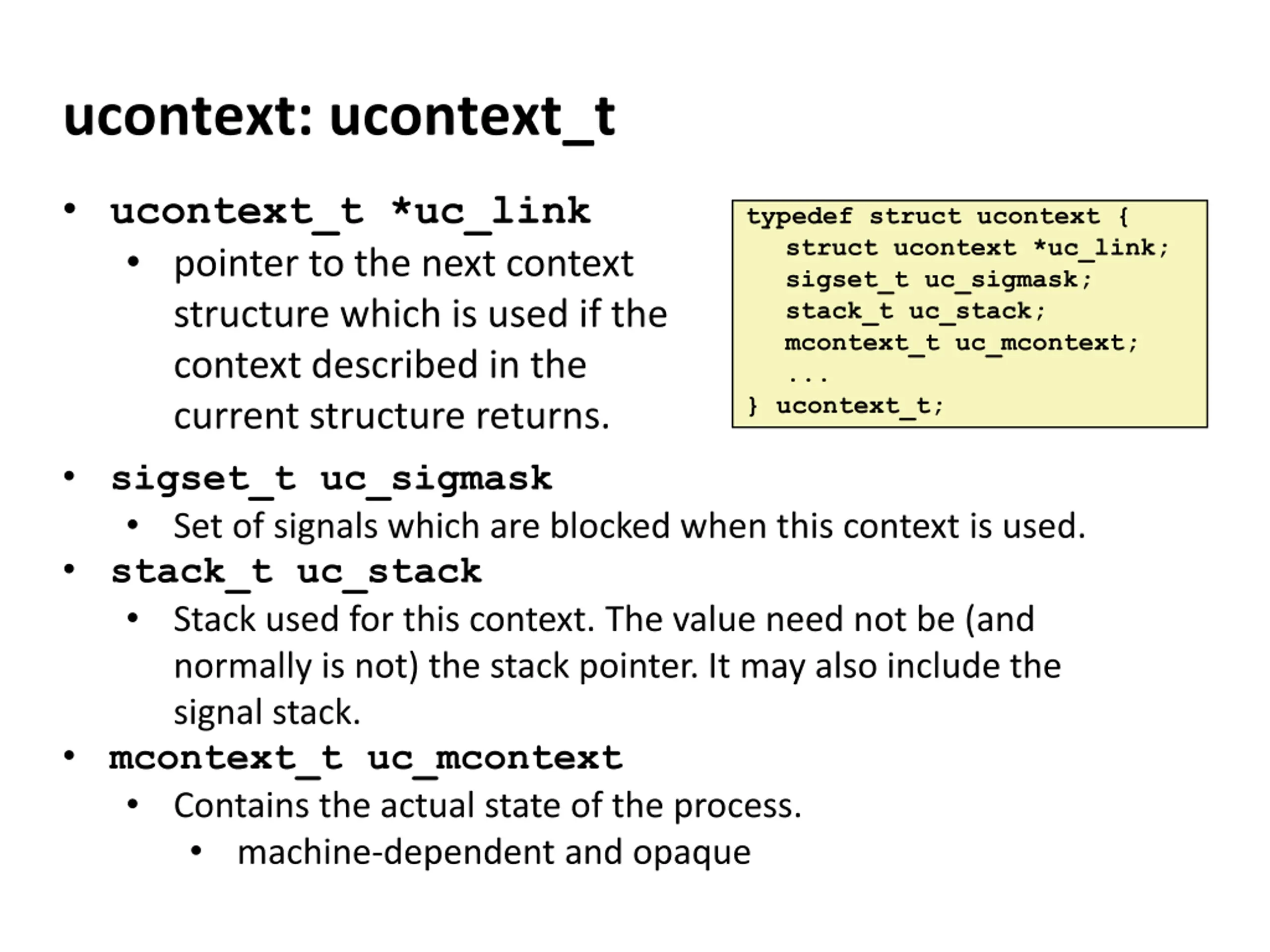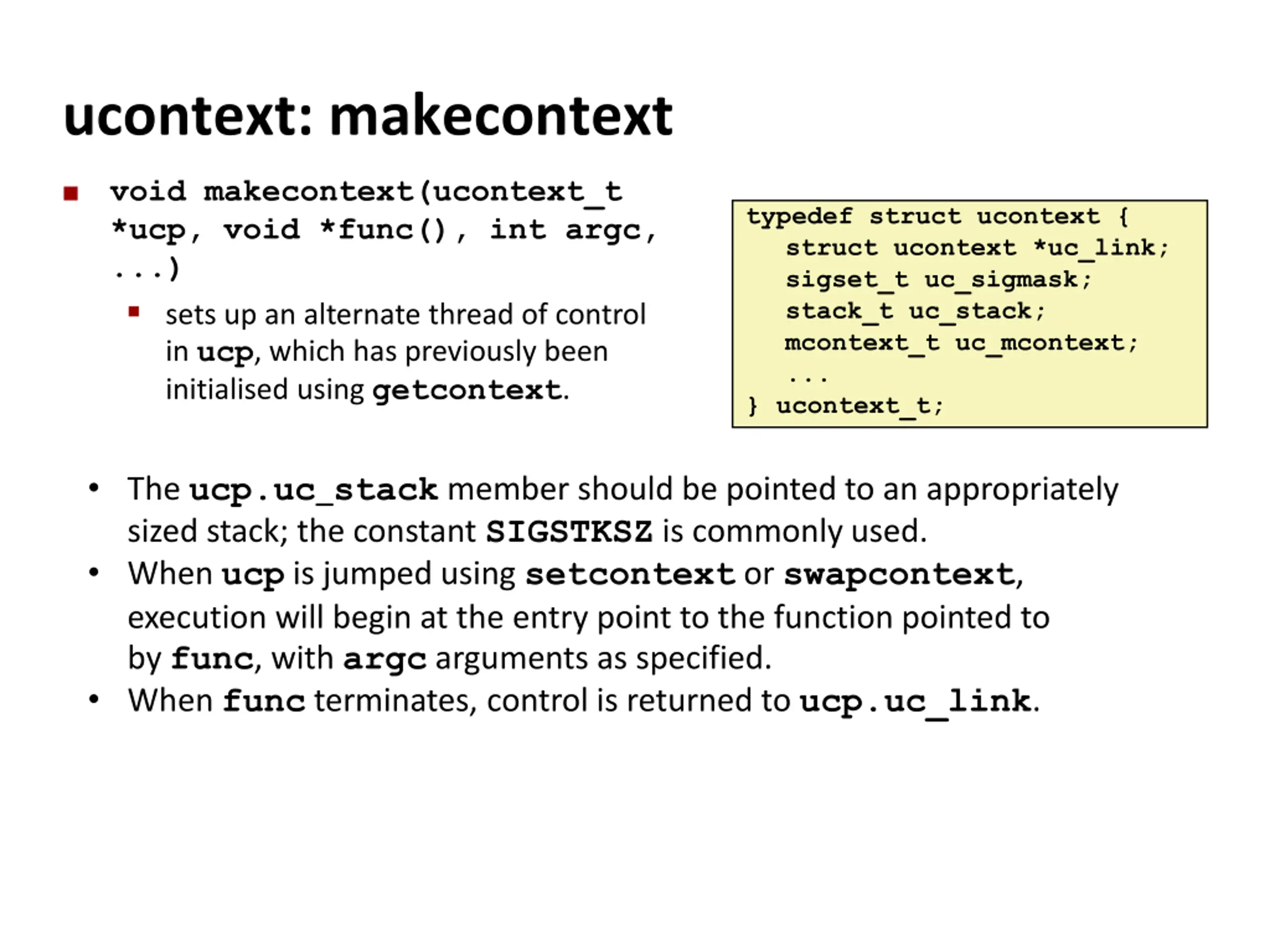 Carnegie Mellon ucontext: makecontext void makecontext(ucontext_t *ucp, void *func(), int argc, ...) sets up an alternate thread of control in ucp, which has previously been initialised using getcontext. typedef struct ucontext { struct ucontext *uc_link; sigset_t uc_sigmask; stack_t uc_stack; mcontext_t uc_mcontext; ... } ucontext_t; The ucp.uc_stack member should be pointed to an appropriately sized stack; the constant SIGSTKSZ is commonly used. When ucp is jumped using setcontext or swapcontext, execution will begin at the entry point to the function pointed to by func, with argc arguments as specified. When func terminates, control is returned to ucp.uc_link.