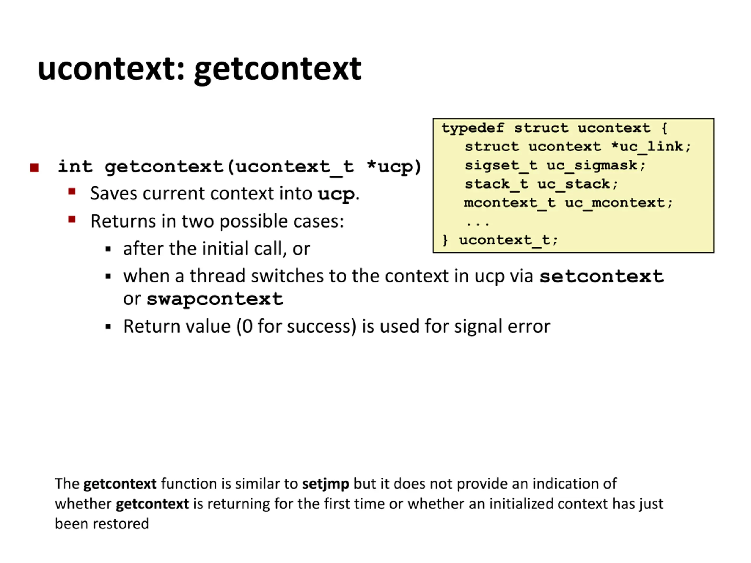 Carnegie Mellon ucontext: getcontext typedef struct ucontext { struct ucontext *uc_link; sigset_t uc_sigmask; stack_t uc_stack; mcontext_t uc_mcontext; ... } ucontext_t; int getcontext(ucontext_t *ucp) Saves current context into ucp. Returns in two possible cases: after the initial call, or when a thread switches to the context in ucp via setcontext or swapcontext Return value (0 for success) is used for signal error the programmer must use an explicit flag variable, which must not be a register variable and must be declared volatile. The getcontext function is similar to setjmp but it does not provide an indication of whether getcontext is returning for the first time or whether an initialized context has just been restored