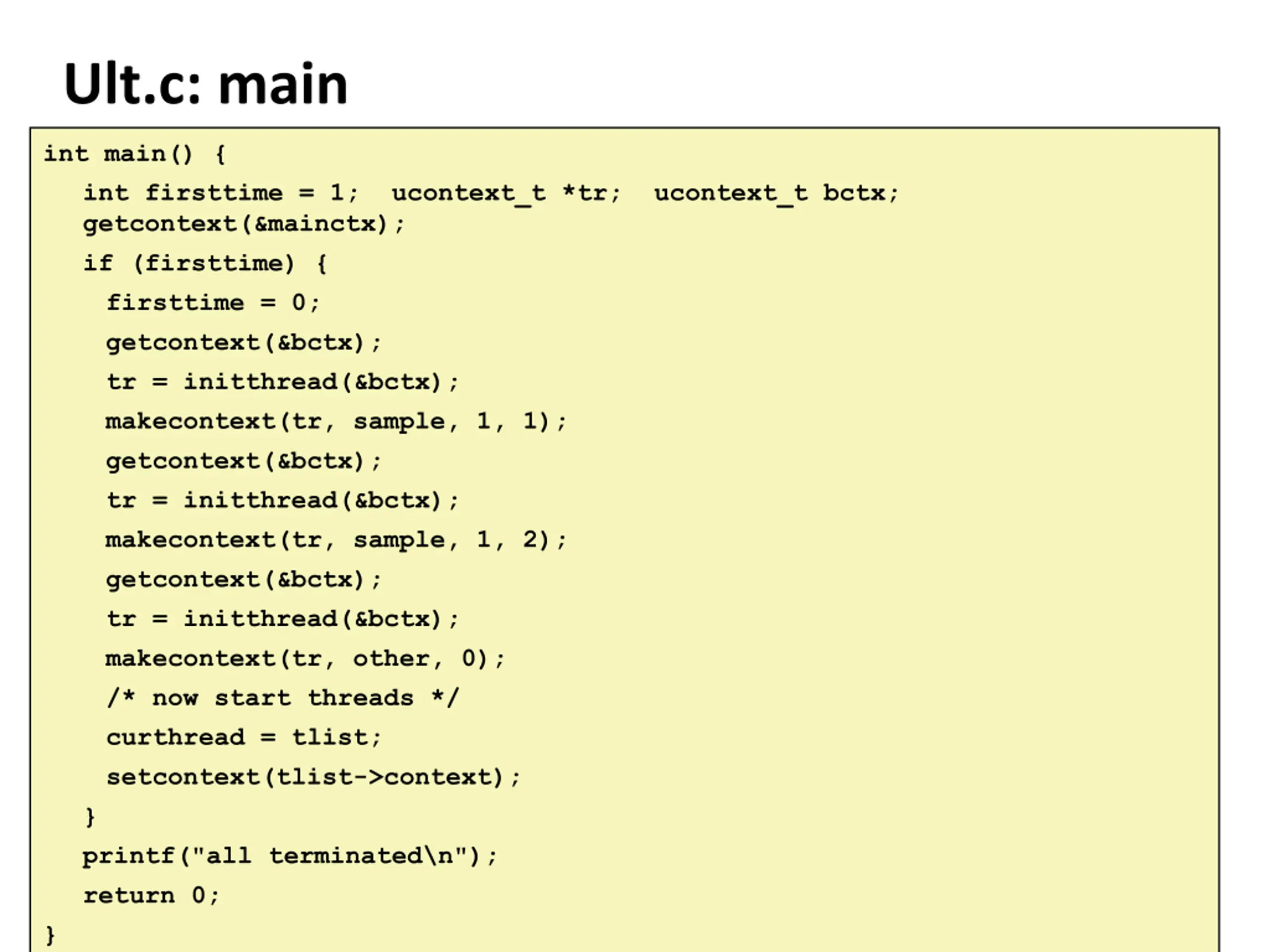 Carnegie Mellon Ult.c: main int main() { int firsttime = 1; ucontext_t *tr; ucontext_t bctx; getcontext(&mainctx); if (firsttime) { firsttime = 0; getcontext(&bctx); tr = initthread(&bctx); makecontext(tr, sample, 1, 1); getcontext(&bctx); tr = initthread(&bctx); makecontext(tr, sample, 1, 2); getcontext(&bctx); tr = initthread(&bctx); makecontext(tr, other, 0); /* now start threads */ curthread = tlist; setcontext(tlist->context); } printf("all terminated\n"); return 0; }