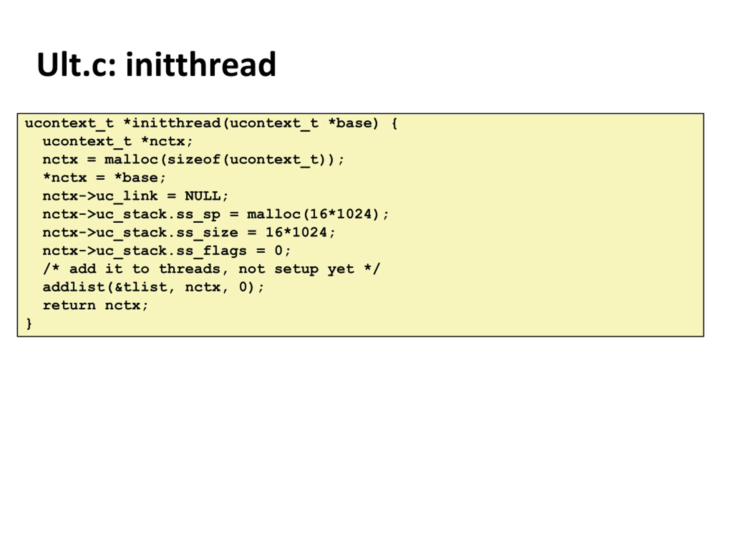 Carnegie Mellon Ult.c: initthread ucontext_t *initthread(ucontext_t *base) { ucontext_t *nctx; nctx = malloc(sizeof(ucontext_t)); *nctx = *base; nctx->uc_link = NULL; nctx->uc_stack.ss_sp = malloc(16*1024); nctx->uc_stack.ss_size = 16*1024; nctx->uc_stack.ss_flags = 0; /* add it to threads, not setup yet */ addlist(&tlist, nctx, 0); return nctx; }