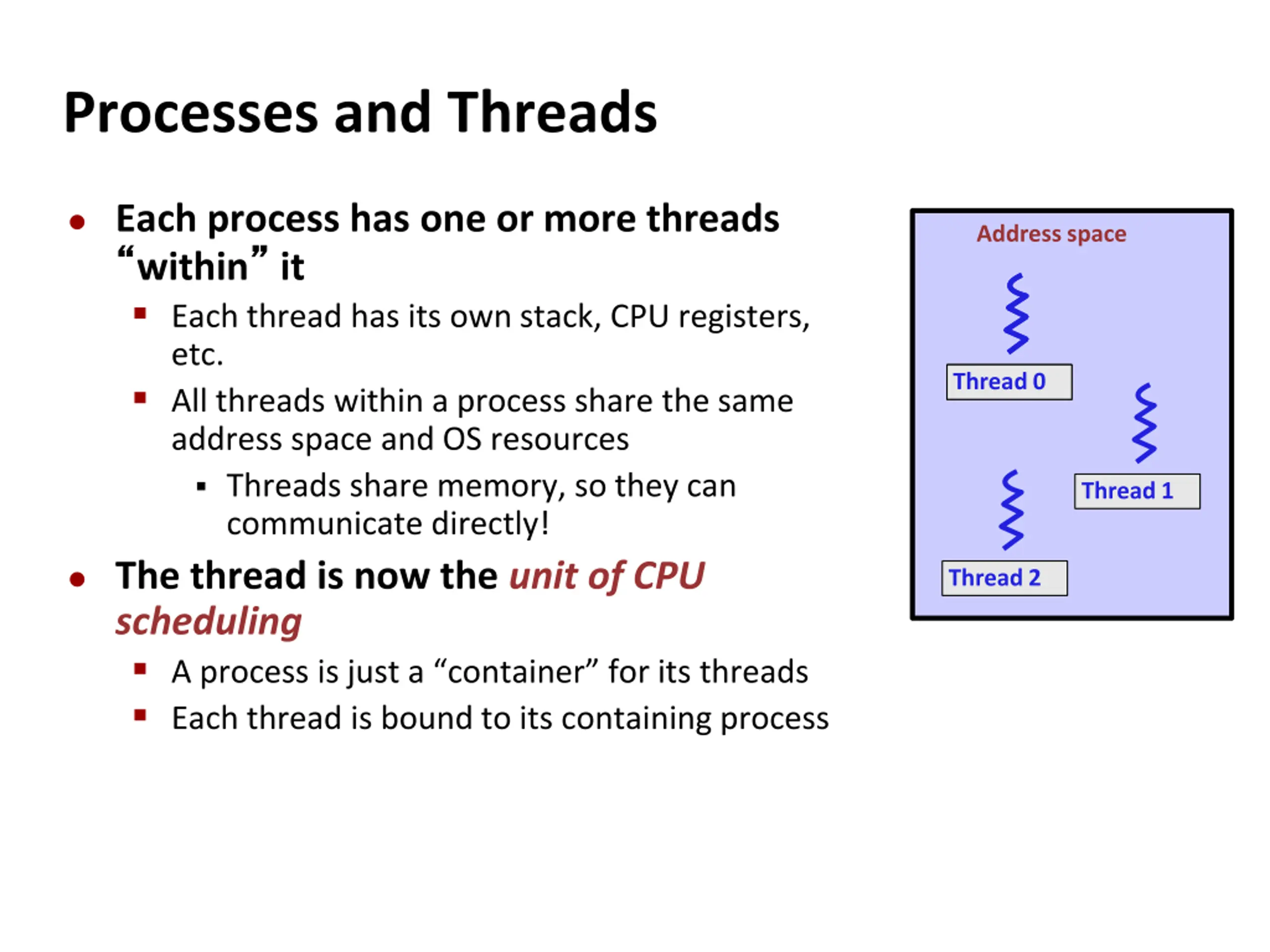 Carnegie Mellon Processes and Threads Each process has one or more threads within it Each thread has its own stack, CPU registers, etc. All threads within a process share the same address space and OS resources Threads share memory, so they can communicate directly! Address space Thread 0 Thread 0 Thread 1 The thread is now the unit of CPU scheduling A process is just a container for its threads Each thread is bound to its containing process Thread 2