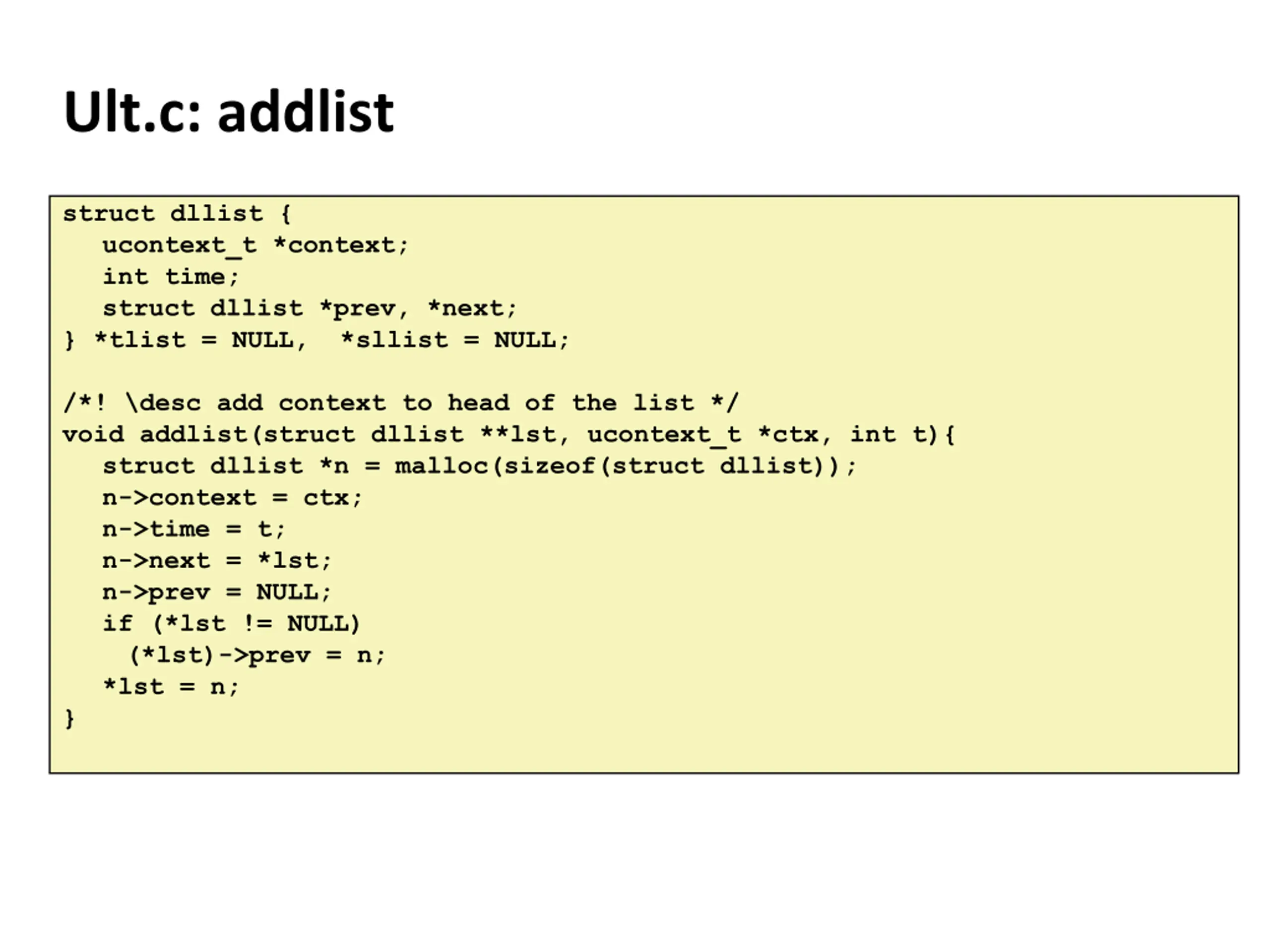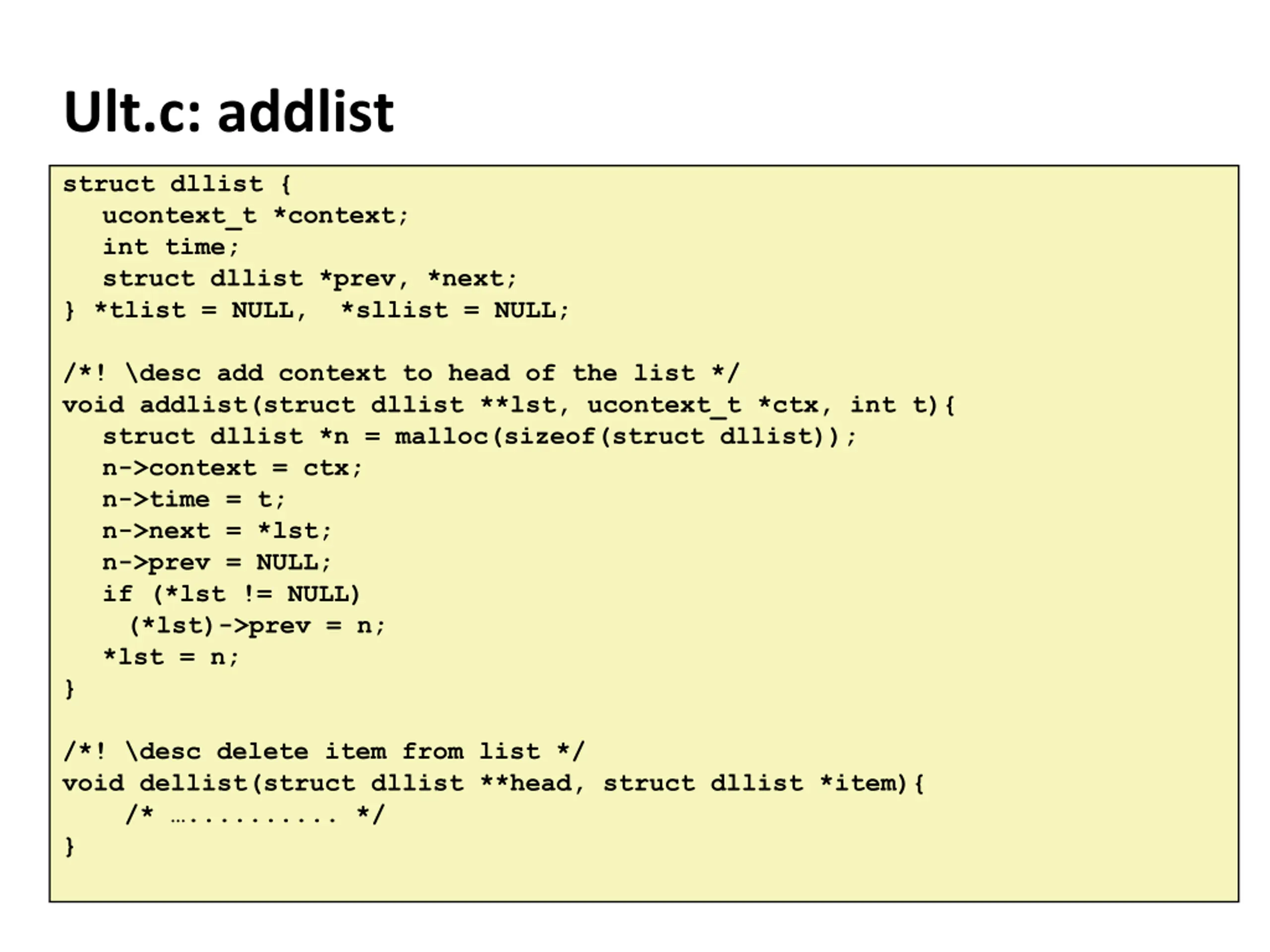 Carnegie Mellon Ult.c: addlist struct dllist { ucontext_t *context; int time; struct dllist *prev, *next; } *tlist = NULL, *sllist = NULL; /*! \desc add context to head of the list */ void addlist(struct dllist **lst, ucontext_t *ctx, int t){ struct dllist *n = malloc(sizeof(struct dllist)); n->context = ctx; n->time = t; n->next = *lst; n->prev = NULL; if (*lst != NULL) (*lst)->prev = n; *lst = n; } /*! \desc delete item from list */ void dellist(struct dllist **head, struct dllist *item){ /* .......... */ }