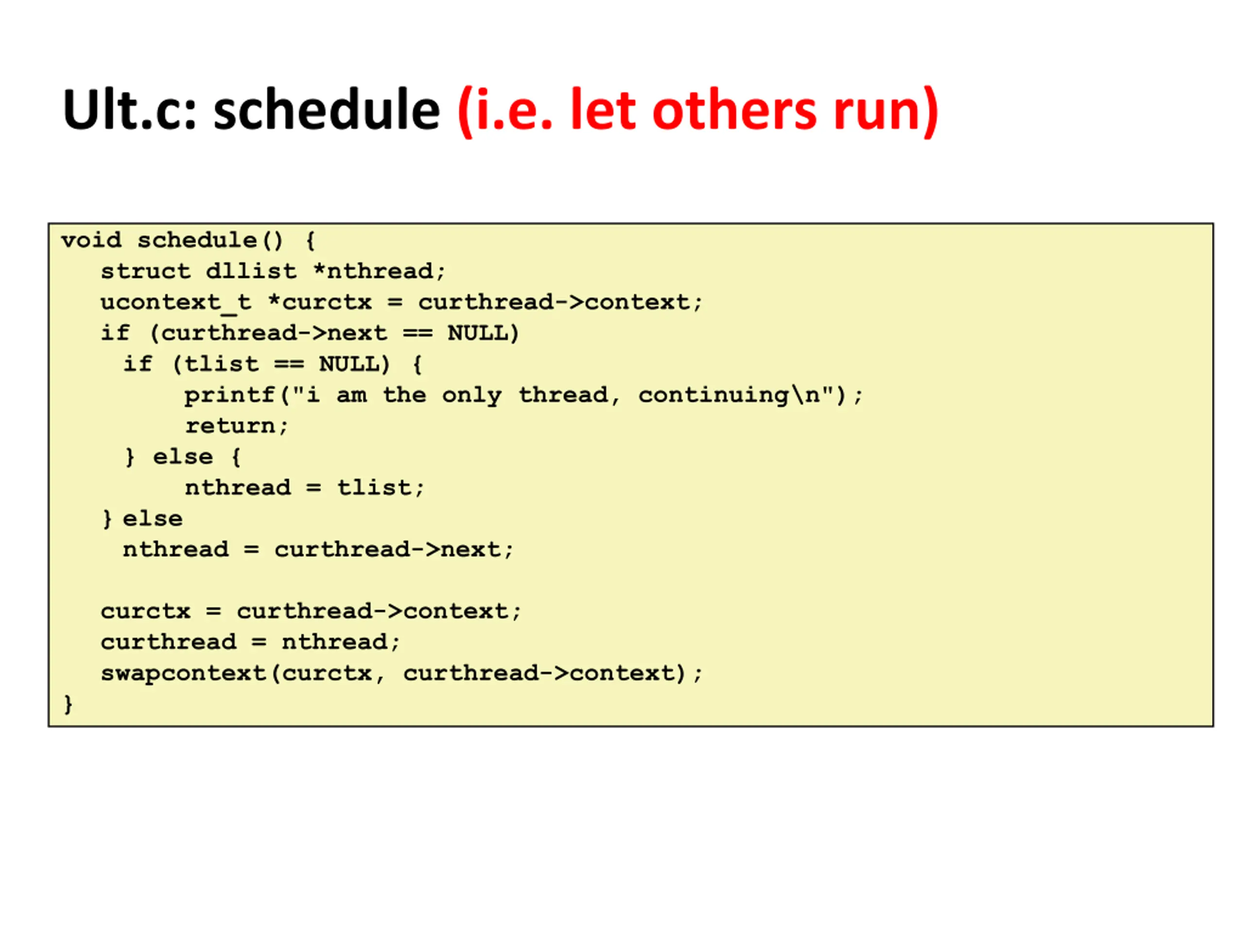 Carnegie Mellon Ult.c: schedule (i.e. let others run) void schedule() { struct dllist *nthread; ucontext_t *curctx = curthread->context; if (curthread->next == NULL) if (tlist == NULL) { printf("i am the only thread, continuing\n"); return; } else { nthread = tlist; } else nthread = curthread->next; } curctx = curthread->context; curthread = nthread; swapcontext(curctx, curthread->context);