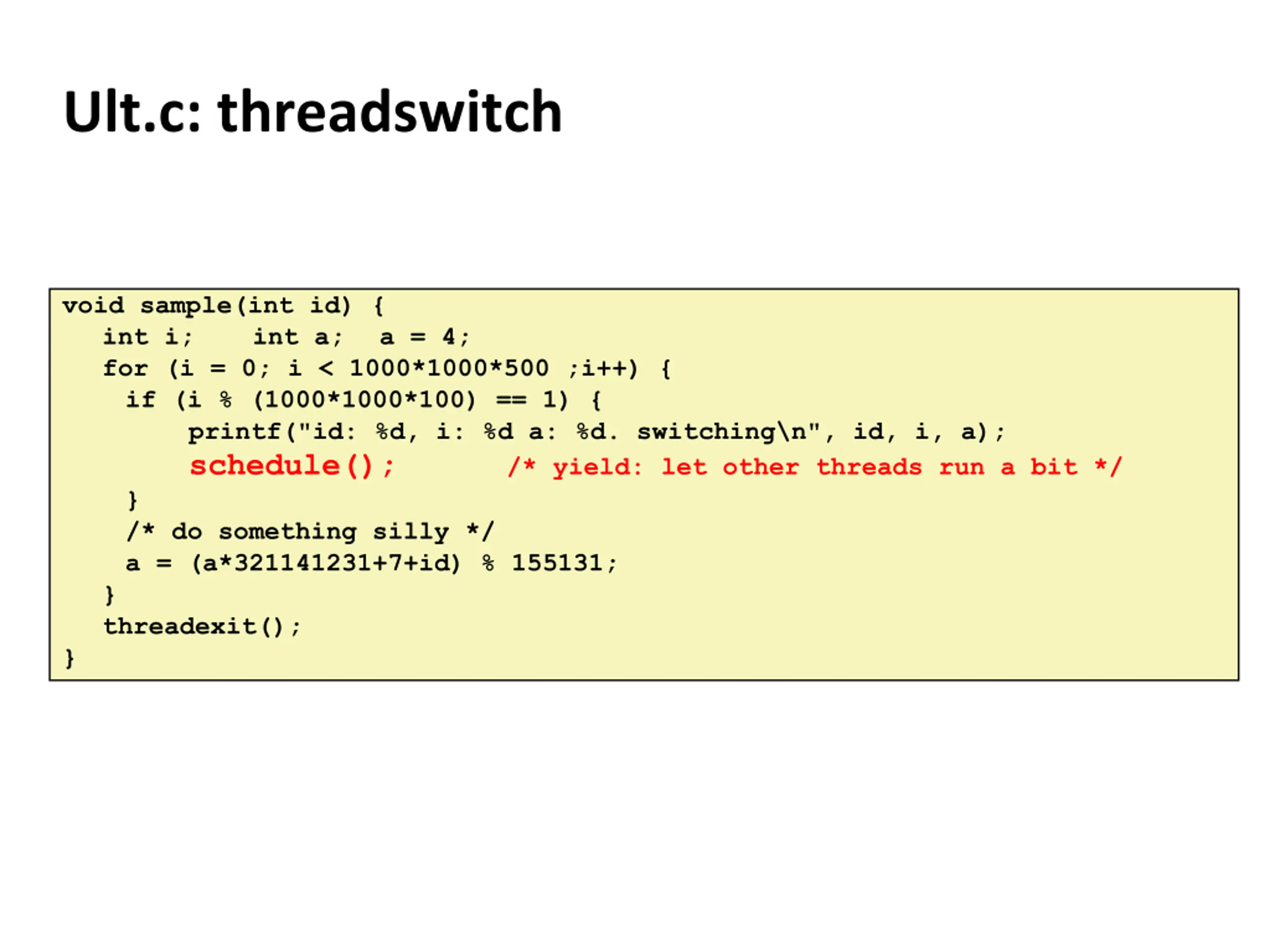Carnegie Mellon Ult.c: threadswitch void sample(int id) { int i; for (i = 0; i < 1000*1000*500 ;i++) { if (i % (1000*1000*100) == 1) { printf("id: %d, i: %d a: %d. switching\n", id, i, a); schedule(); /* yield: let other threads run a bit */ } /* do something silly */ a = (a*321141231+7+id) % 155131; } threadexit(); } int a; a = 4;