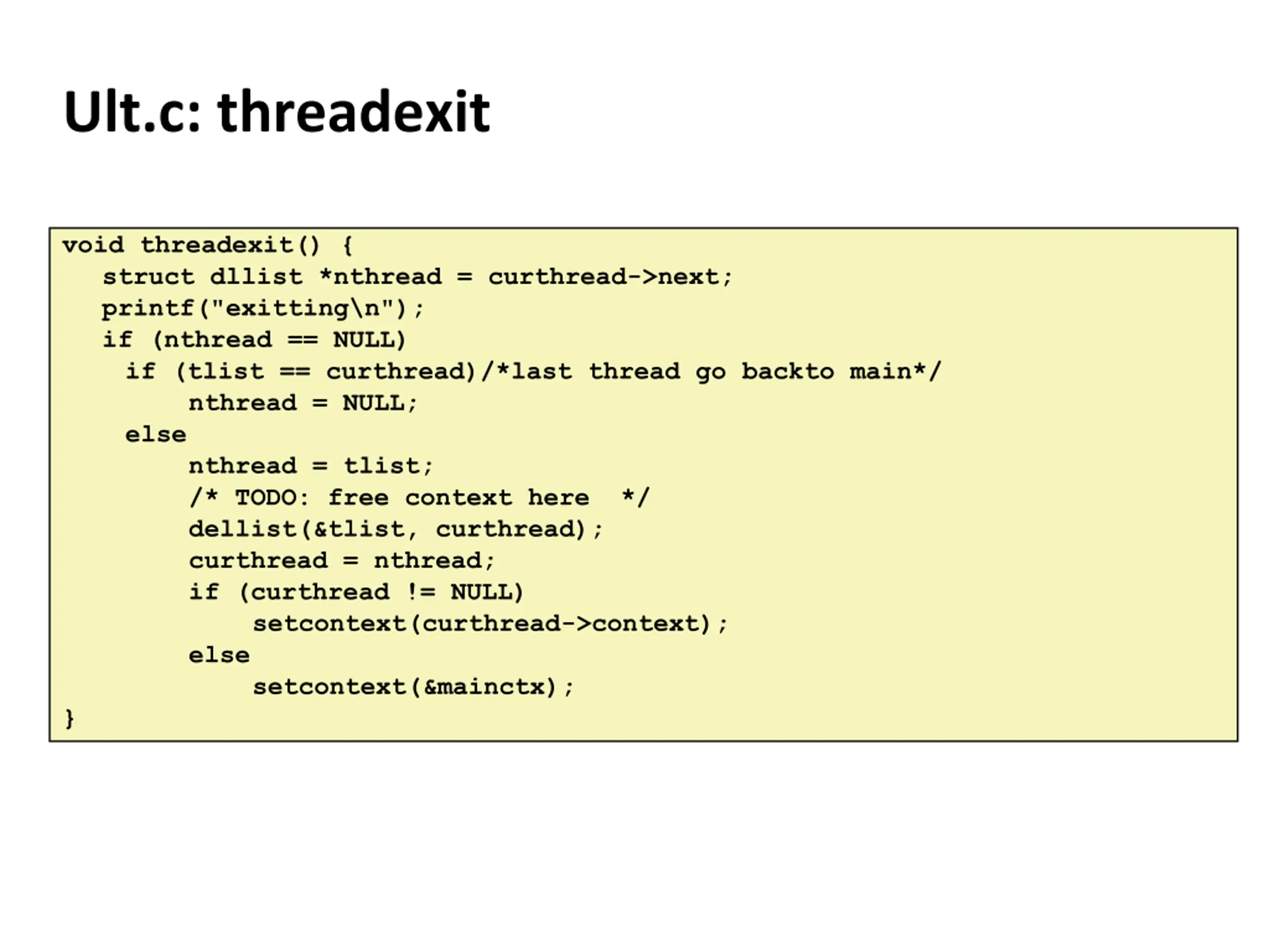 Carnegie Mellon Ult.c: threadexit void threadexit() { struct dllist *nthread = curthread->next; printf("exitting\n"); if (nthread == NULL) if (tlist == curthread)/*last thread go backto main*/ nthread = NULL; else nthread = tlist; /* TODO: free context here */ dellist(&tlist, curthread); curthread = nthread; if (curthread != NULL) setcontext(curthread->context); else setcontext(&mainctx); }