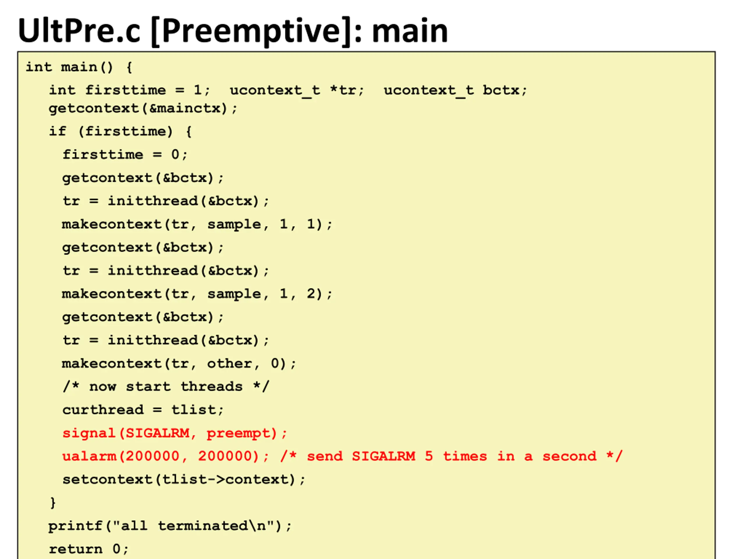 Carnegie Mellon UltPre.c [Preemptive]: main int main() { int firsttime = 1; ucontext_t *tr; ucontext_t bctx; getcontext(&mainctx); if (firsttime) { firsttime = 0; getcontext(&bctx); tr = initthread(&bctx); makecontext(tr, sample, 1, 1); getcontext(&bctx); tr = initthread(&bctx); makecontext(tr, sample, 1, 2); getcontext(&bctx); tr = initthread(&bctx); makecontext(tr, other, 0); /* now start threads */ curthread = tlist; signal(SIGALRM, preempt); ualarm(200000, 200000); /* send SIGALRM 5 times in a second */ setcontext(tlist->context); } printf("all terminated\n"); return 0;