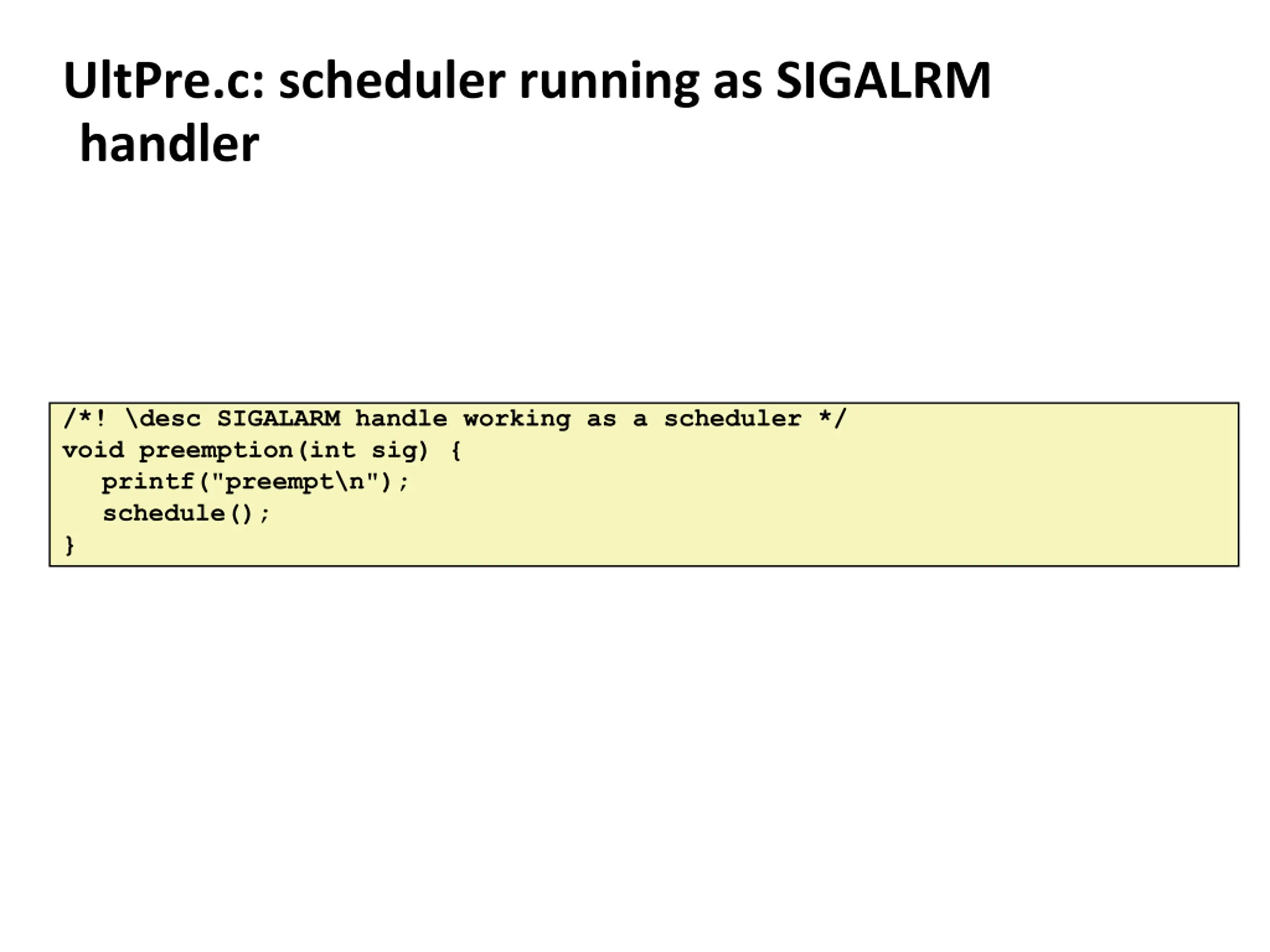 Carnegie Mellon UltPre.c: scheduler running as SIGALRM handler /*! \desc SIGALARM handle working as a scheduler */ void preemption(int sig) { printf("preempt\n"); schedule(); }